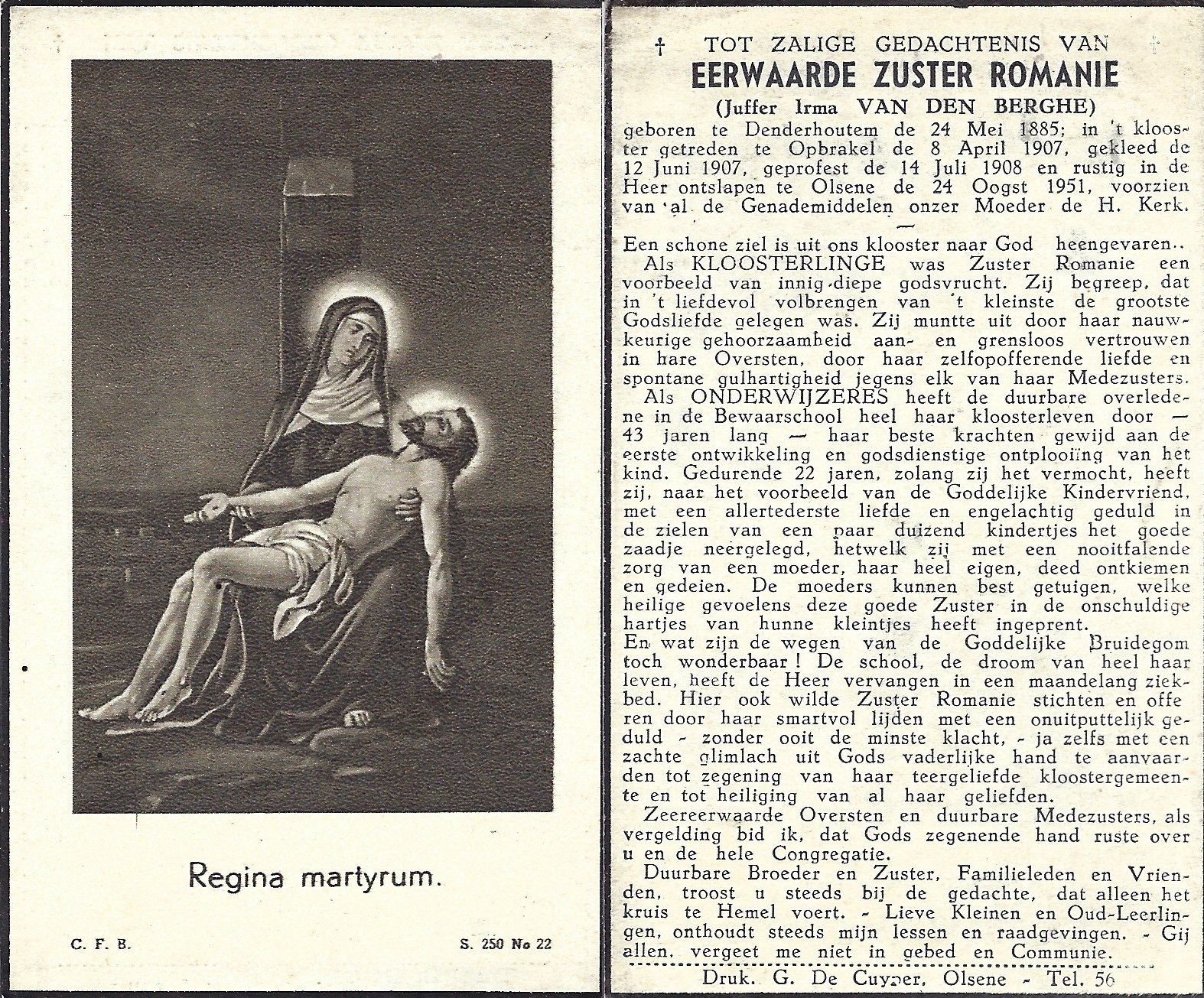 Van Den Berghe Irma, Zuster RomanieDenderhoutem24/05/1885Olsene24/08/1951