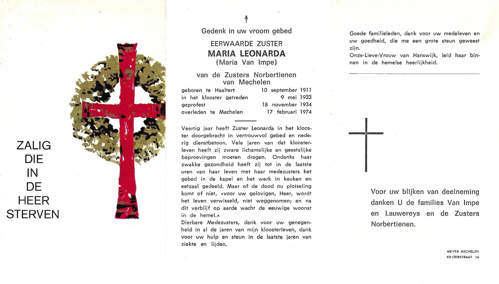 Van Impe Maria, Zuster Maria LeonardaHaaltert10/09/1911Mechelen17/02/1974