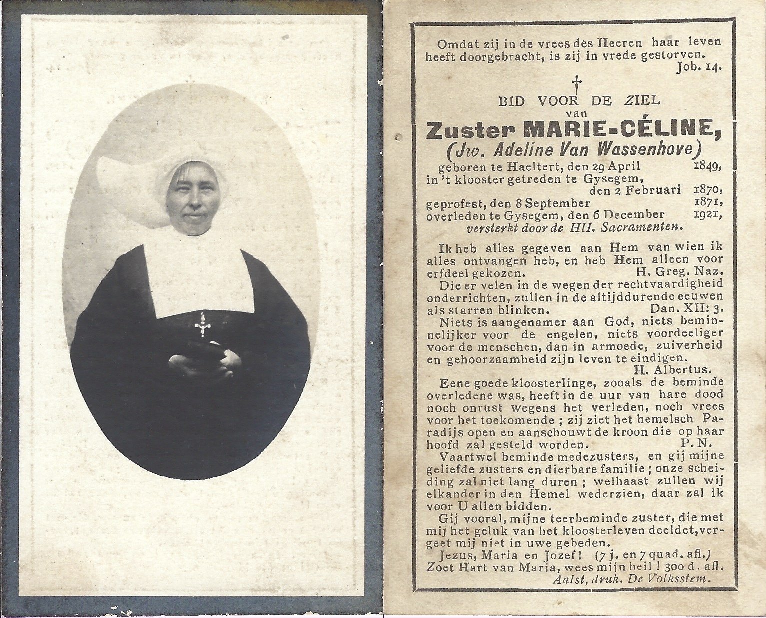 Van Wassenhove Adeline, Zuster Marie-CélineHaaltert29/04/1849Gijzegem06/12/1921