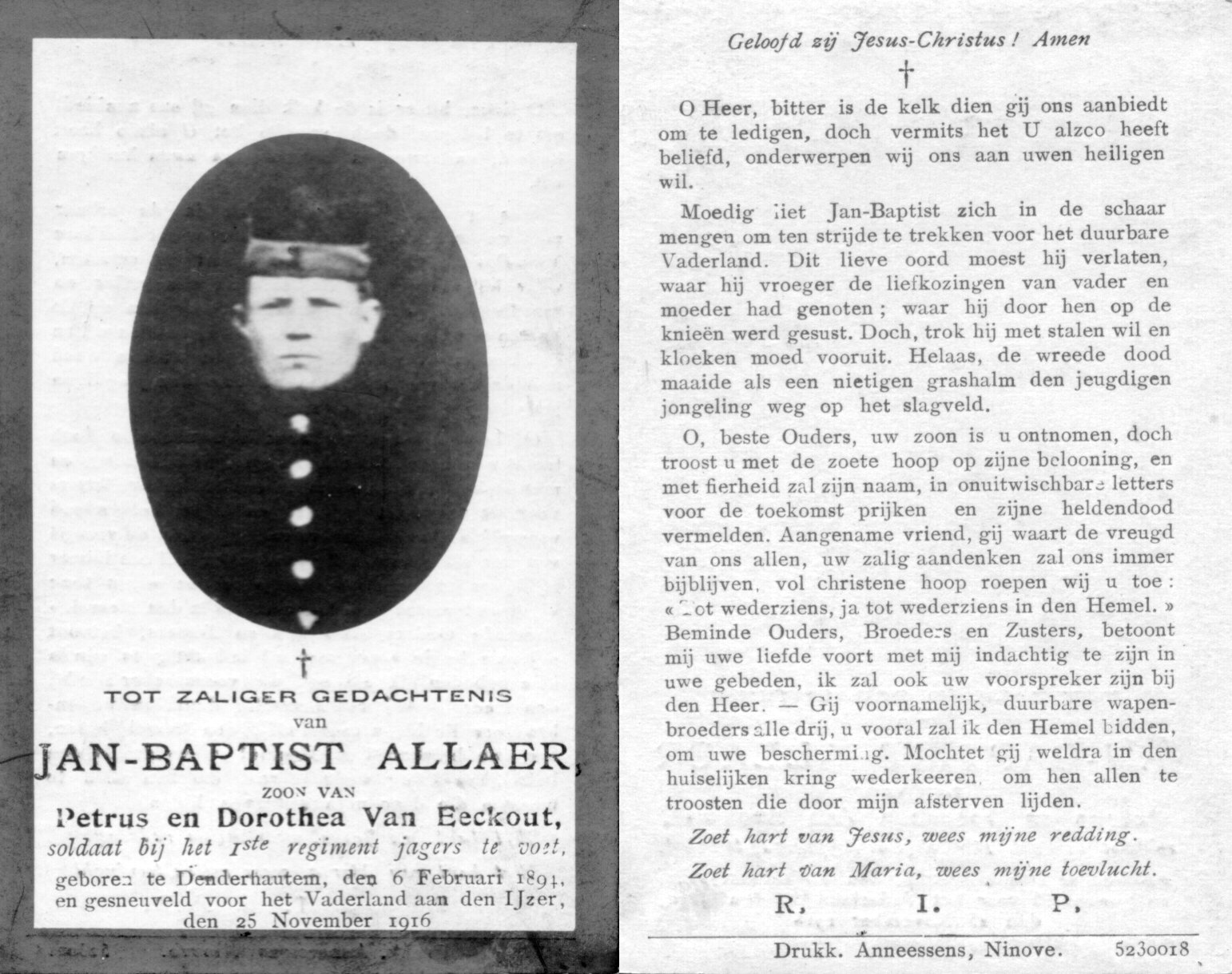 | Allaer Jan | Denderhoutem | 06/02/1894 | Kaaskerke | 25/11/1916 |
