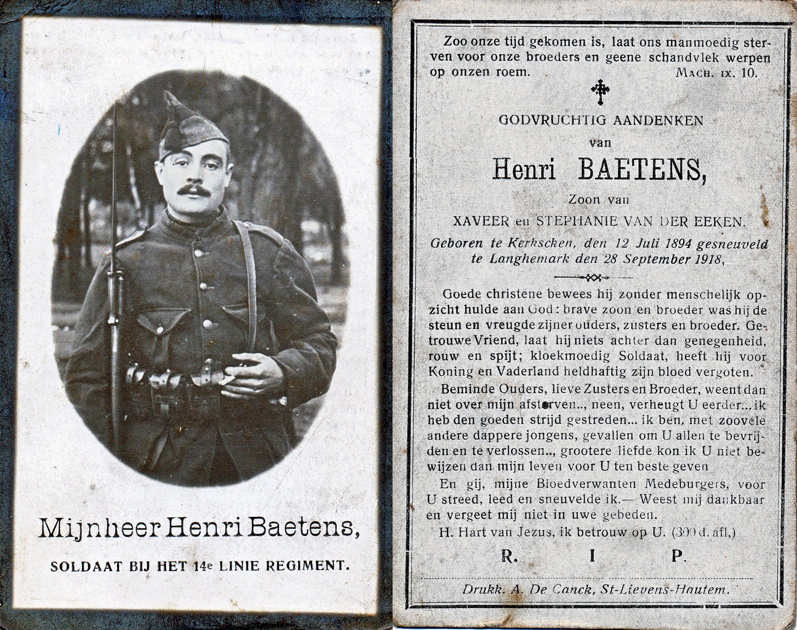 | Baetens Henri | Kerksken | 12/07/1894 | Langemark | 28/09/1918 |