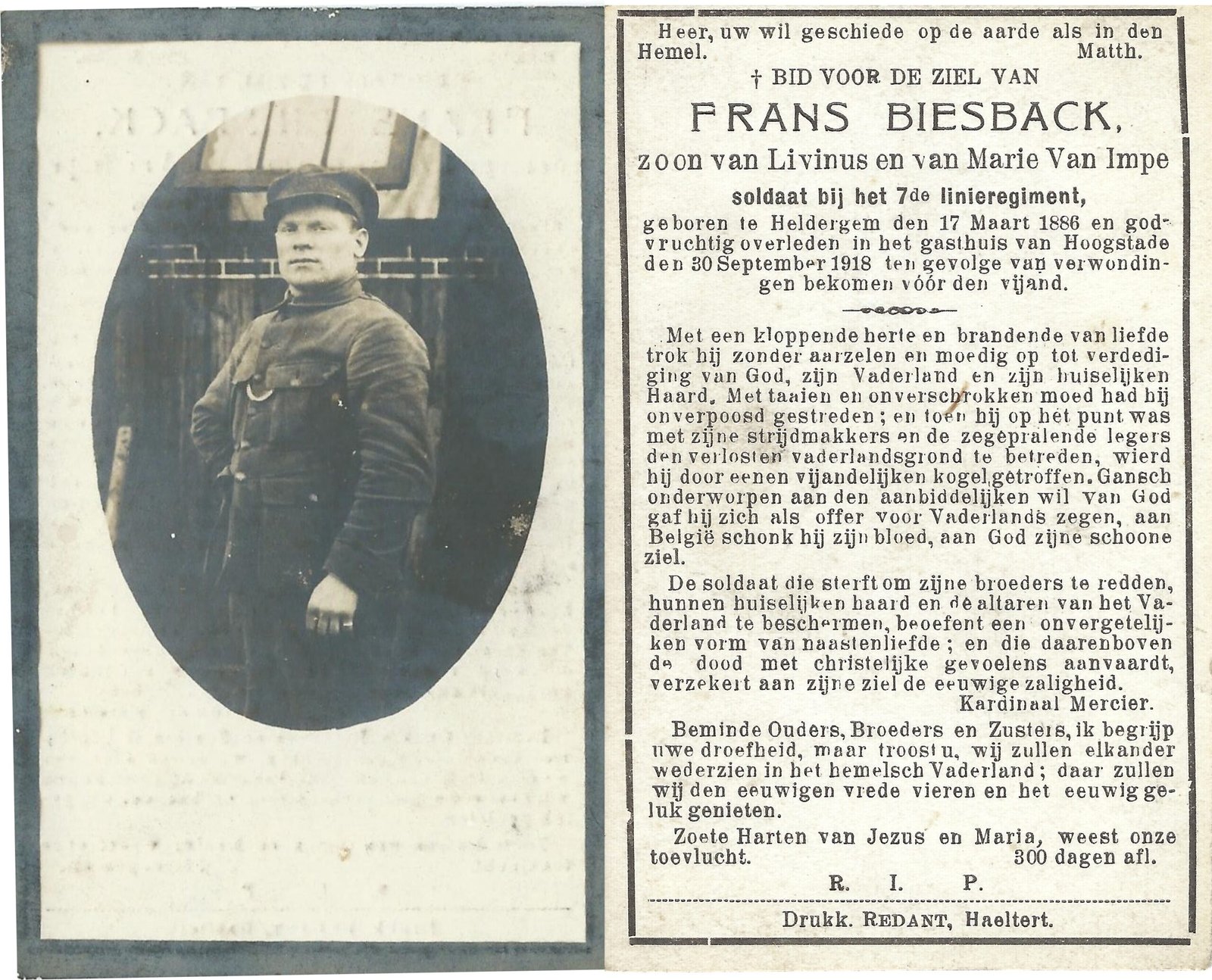 | Biesback Frans | Heldergem | 17/03/1886 | Hoogstade | 30/09/1018 |