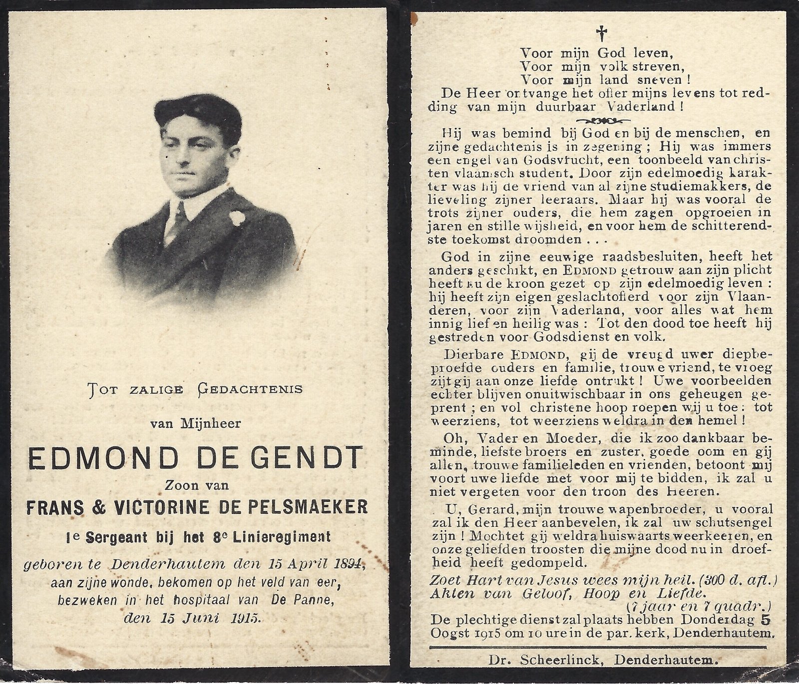 | De Gendt Edmond | Denderhoutem | 15/04/1894 | De Panne | 15/06/1915 |