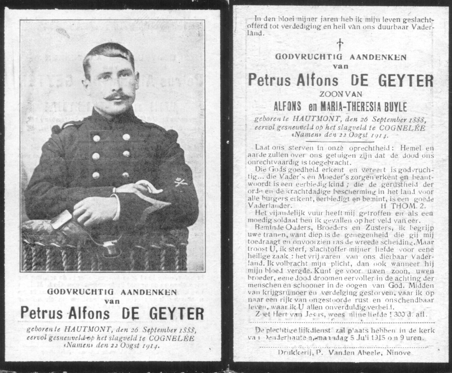 | De Geyter Petrus | Hautmon (Fr) | 26/09/1888 | Champion Cognelée | 22/08/1914 |