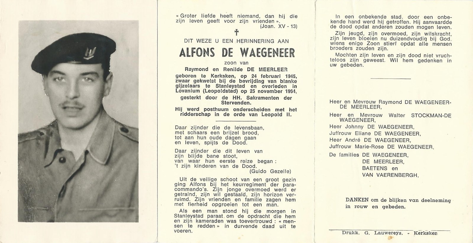 | De Waegeneer Alfons | Kerksken | 24/02/1945 | Leopoldstad (Congo) | 25/11/1964 |
