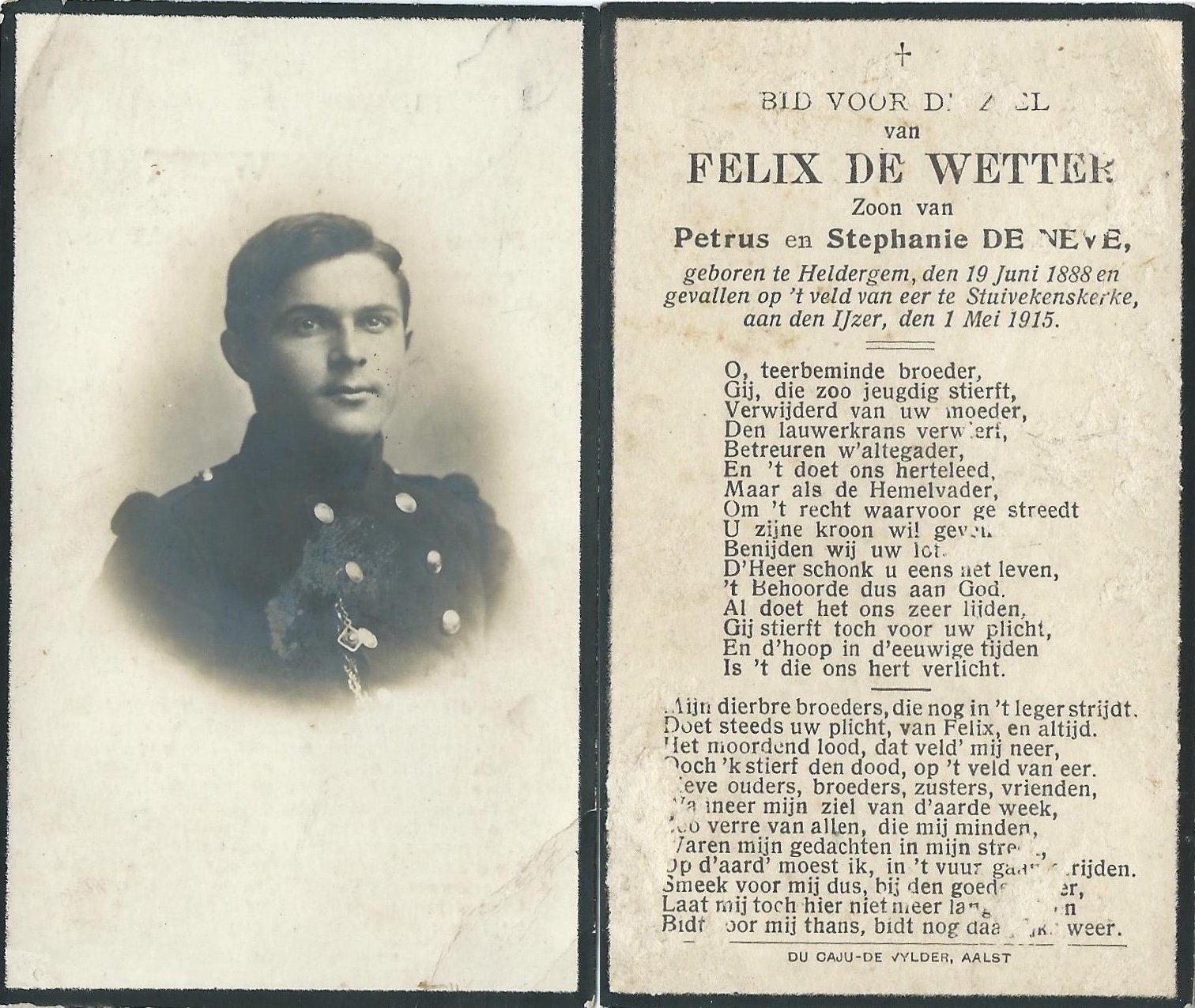 | De Wetter Felix | Heldergem | 19/06/1888 | Stuivekenskerke | 01/05/1915 |