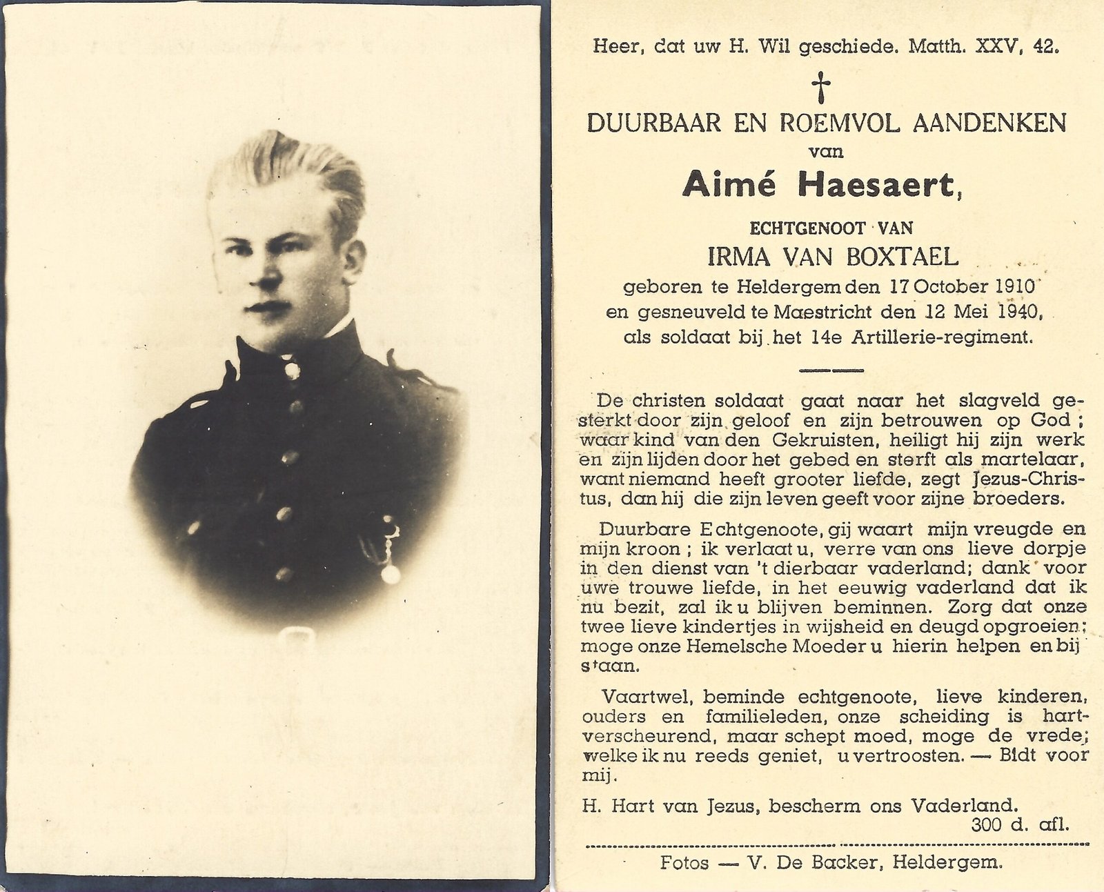 | Haesaert Aimé | Heldergem | 17/10/1910 | Maastricht (Nl) | 12/04/1940 |