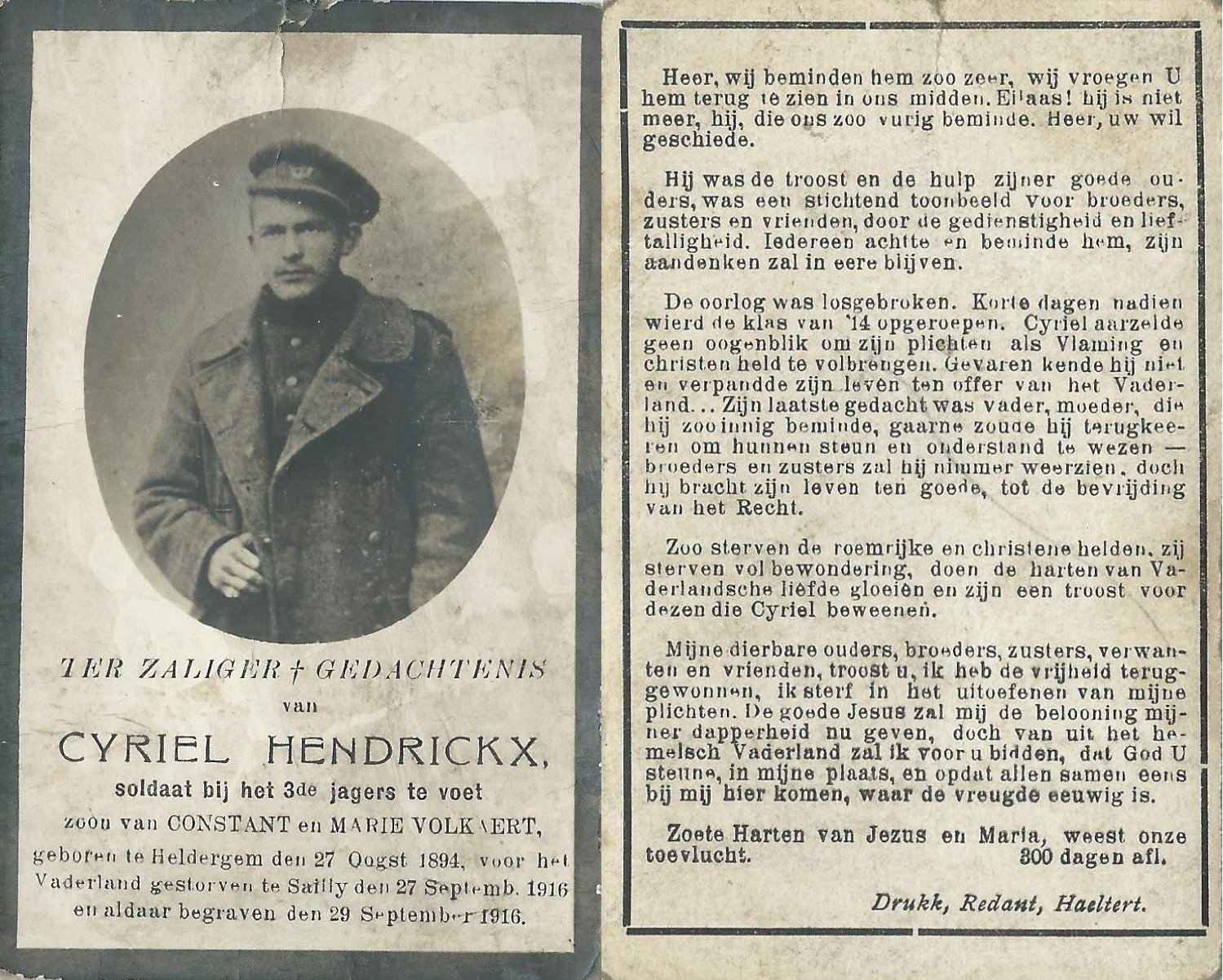 | Hendrickx Cyriel | Heldergem | 27/08/1894 | Chailly-en-Bri (Fr) | 27/09/1916 |