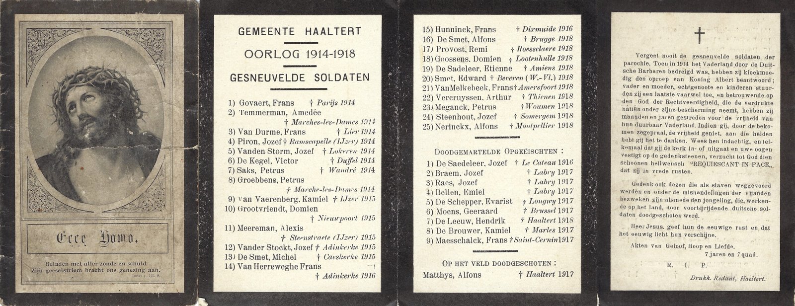 Herdenking 1 jaar wapenstilstand Haaltert bidprentje 01 november 1919