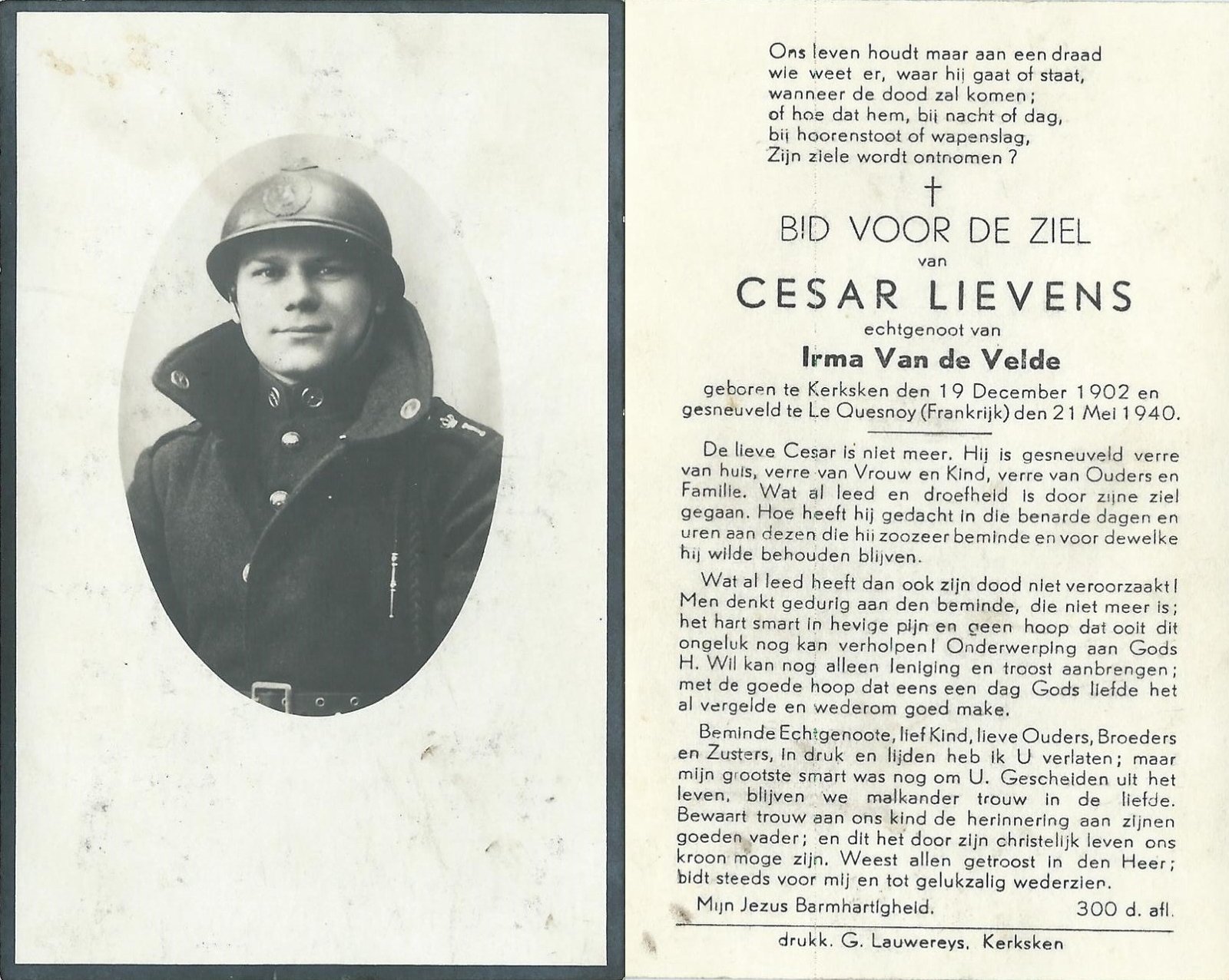| Lievens César | Kerksken | 19/12/1902 | Le Quesnoy en Artois (Fr) | 21/05/1940 |
