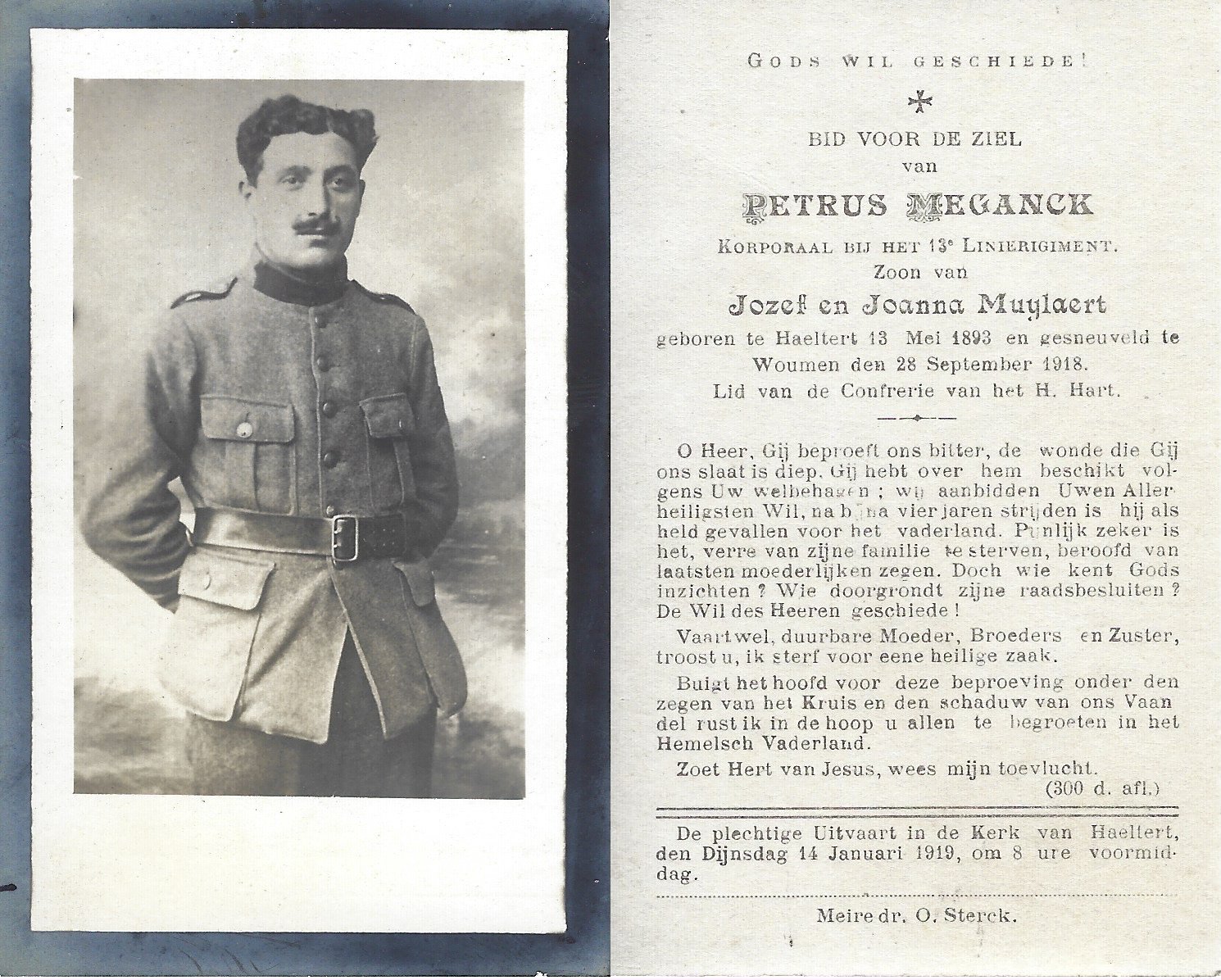 | Meganck Petrus | Haaltert | 13/05/1893 | Woumen | 28/09/1918 |