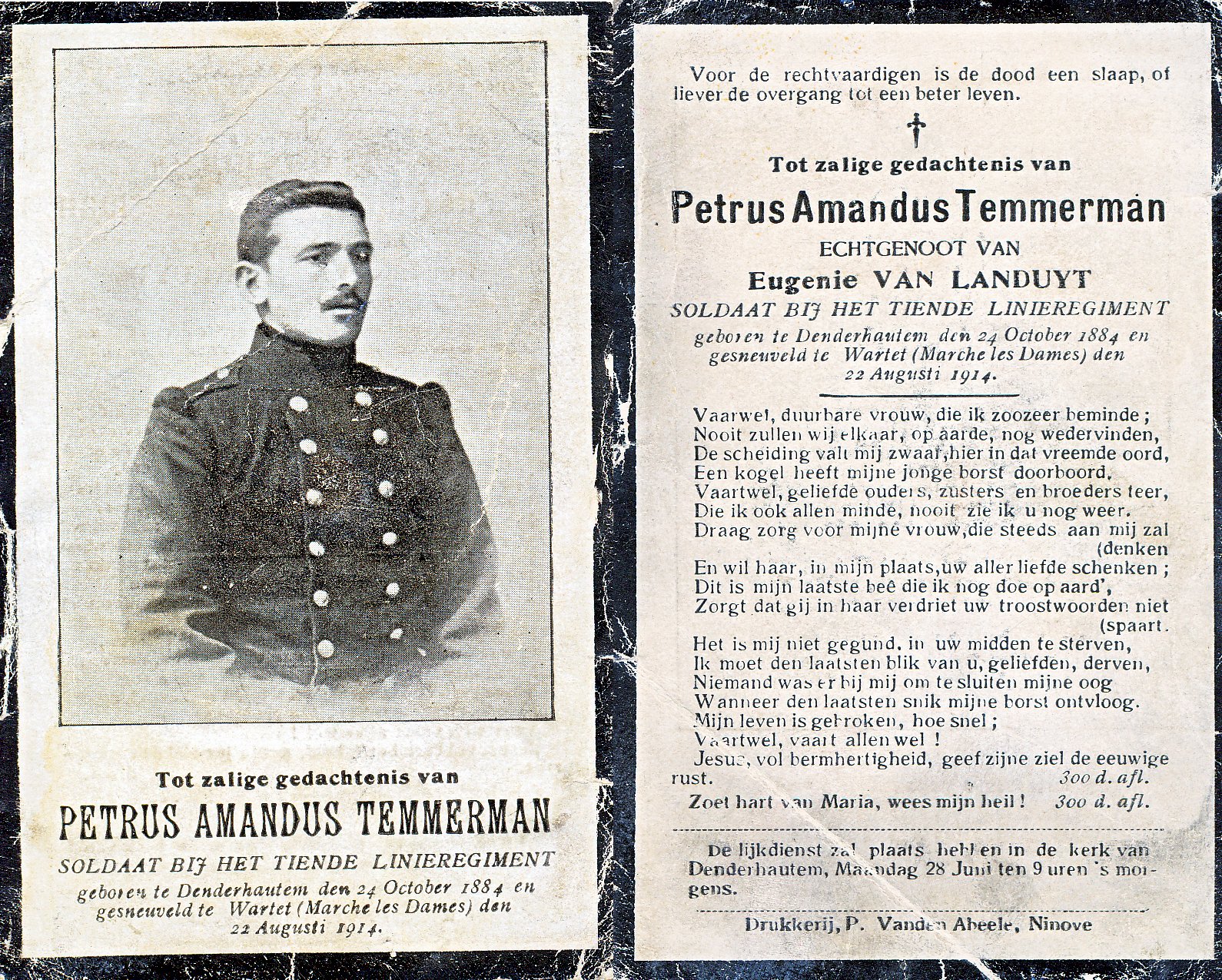 | Temmerman Petrus | Denderhoutem | 24/10/1884 | Wartel | 22/08/1914 |