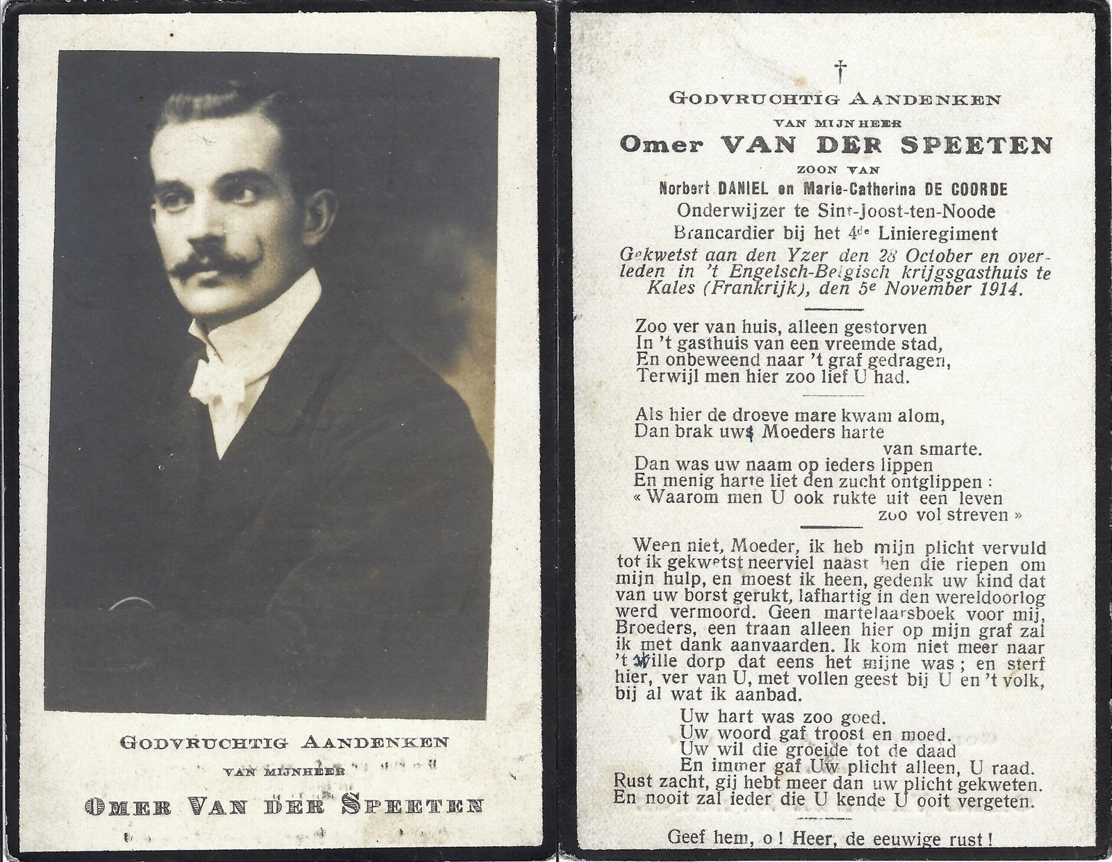 | Van Der Speeten Omer | Denderhoutem | 15/04/1886 | Calais (Fr) | 05/11/1914 |