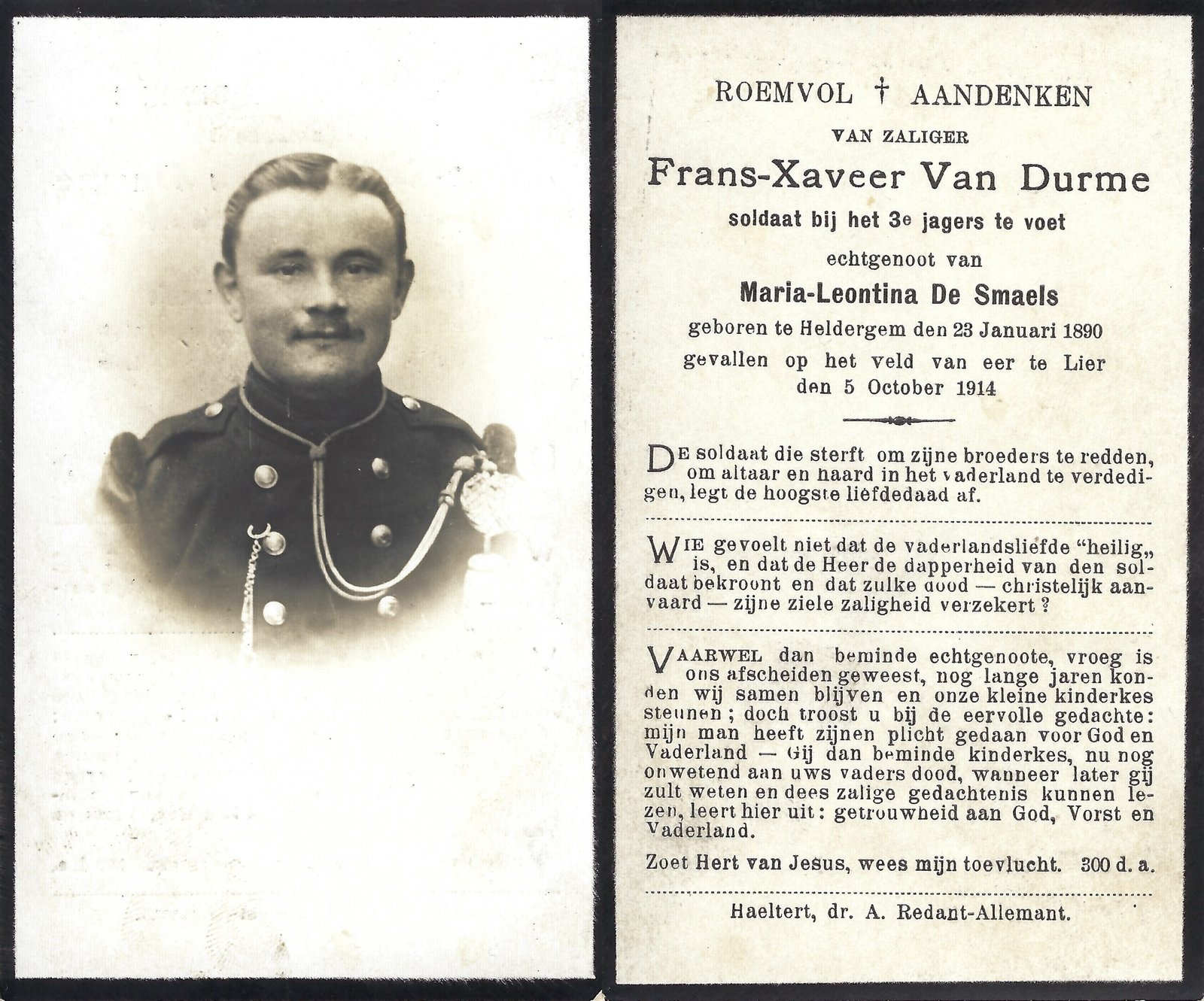 | Van Durme Frans-Xaveer | Heldergem | 23/01/1890 | Lier | 05/10/1914 |