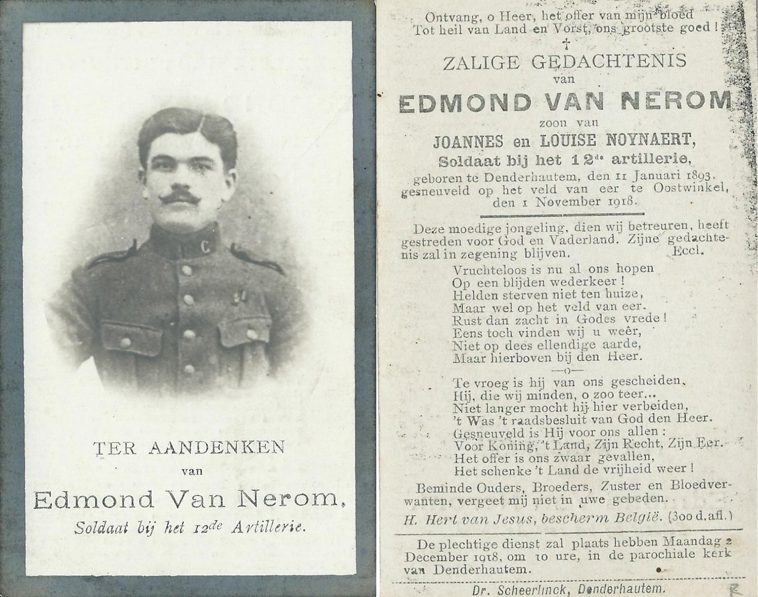 | Van Nerom Edmond | Denderhoutem | 11/01/1893 | Ronsele | 01/11/1918 |