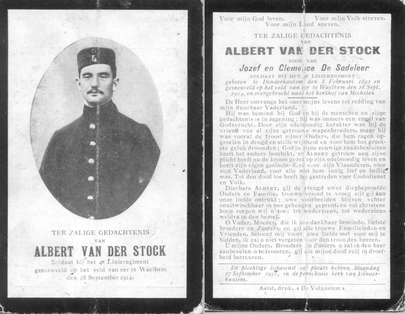 | Van Den Stock Albert | Denderhoutem | 08/02/1891 | Walem | 28/09/1914 |