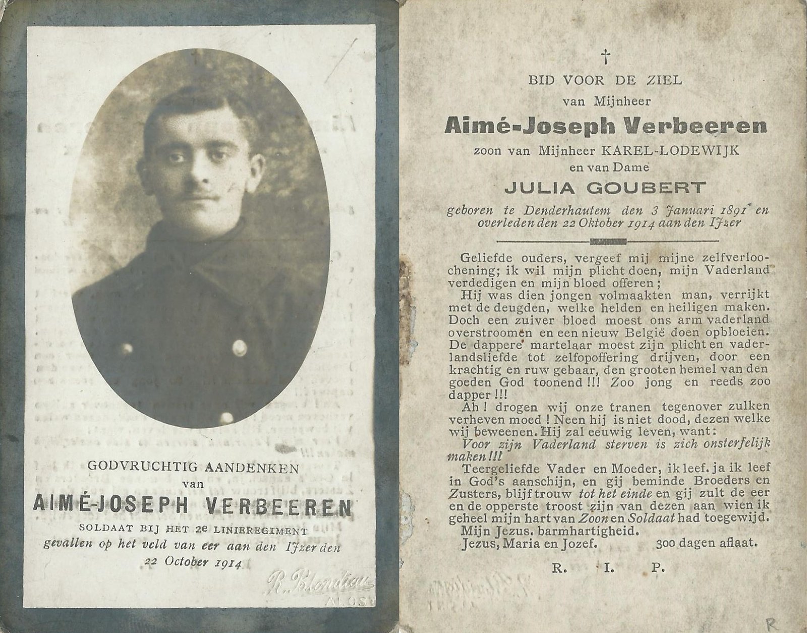 | Verbeeren Aimé | Denderhoutem | 03/01/1891 | Aan den Ijzer | 22/10/1914 |