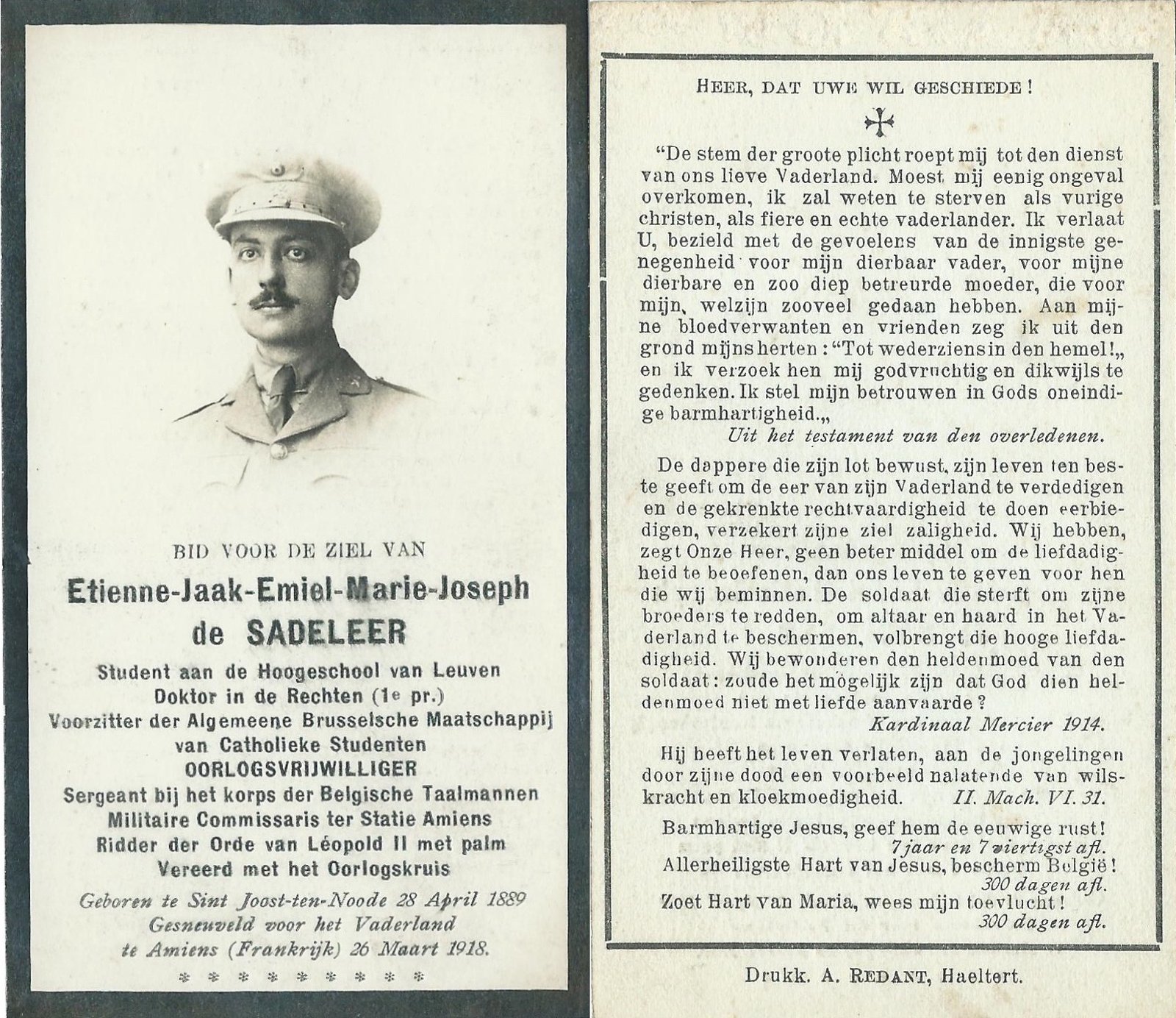 | de Sadeleer Etienne | Sint-Joost-ten-Noode | 28/04/1889 | Amiens (Fr) | 27/03/1918 |