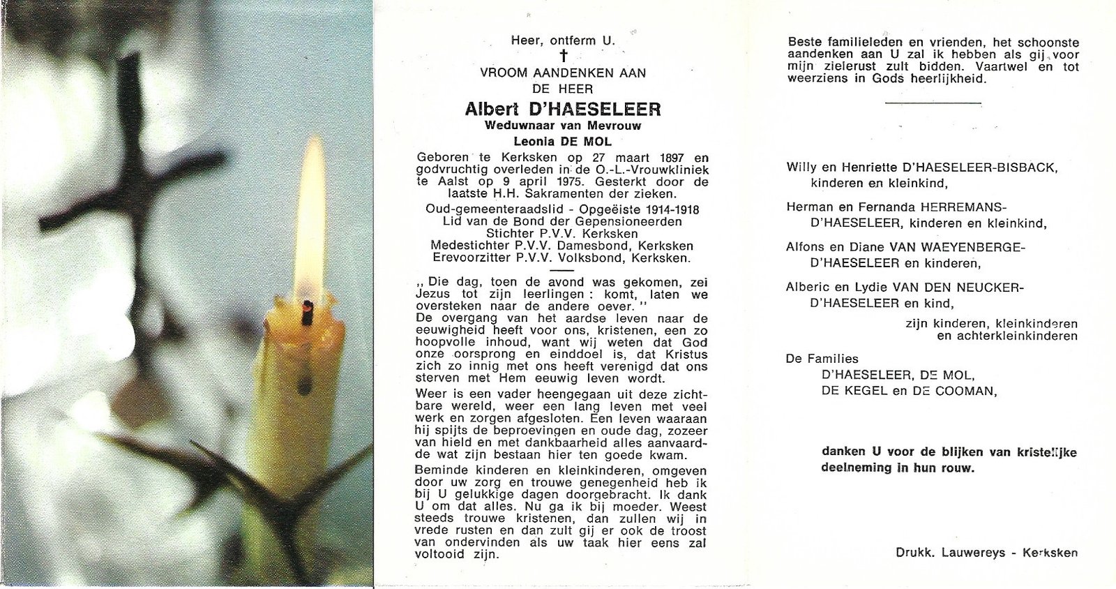 | D’Haeseleer Albert, Gemeenteraadslid Kerksken | Kerksken | 27/03/1897 | Aalst | 09/04/1975 |