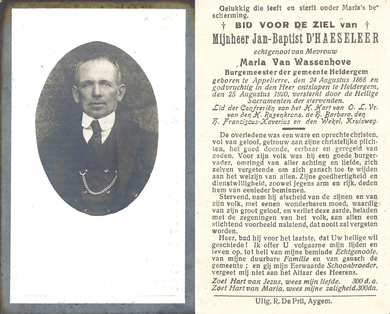 | D’Haeseleer Jan, Burgemeester Heldergem | Appelterre | 24/08/1868 | Heldergem | 25/08/1920 |