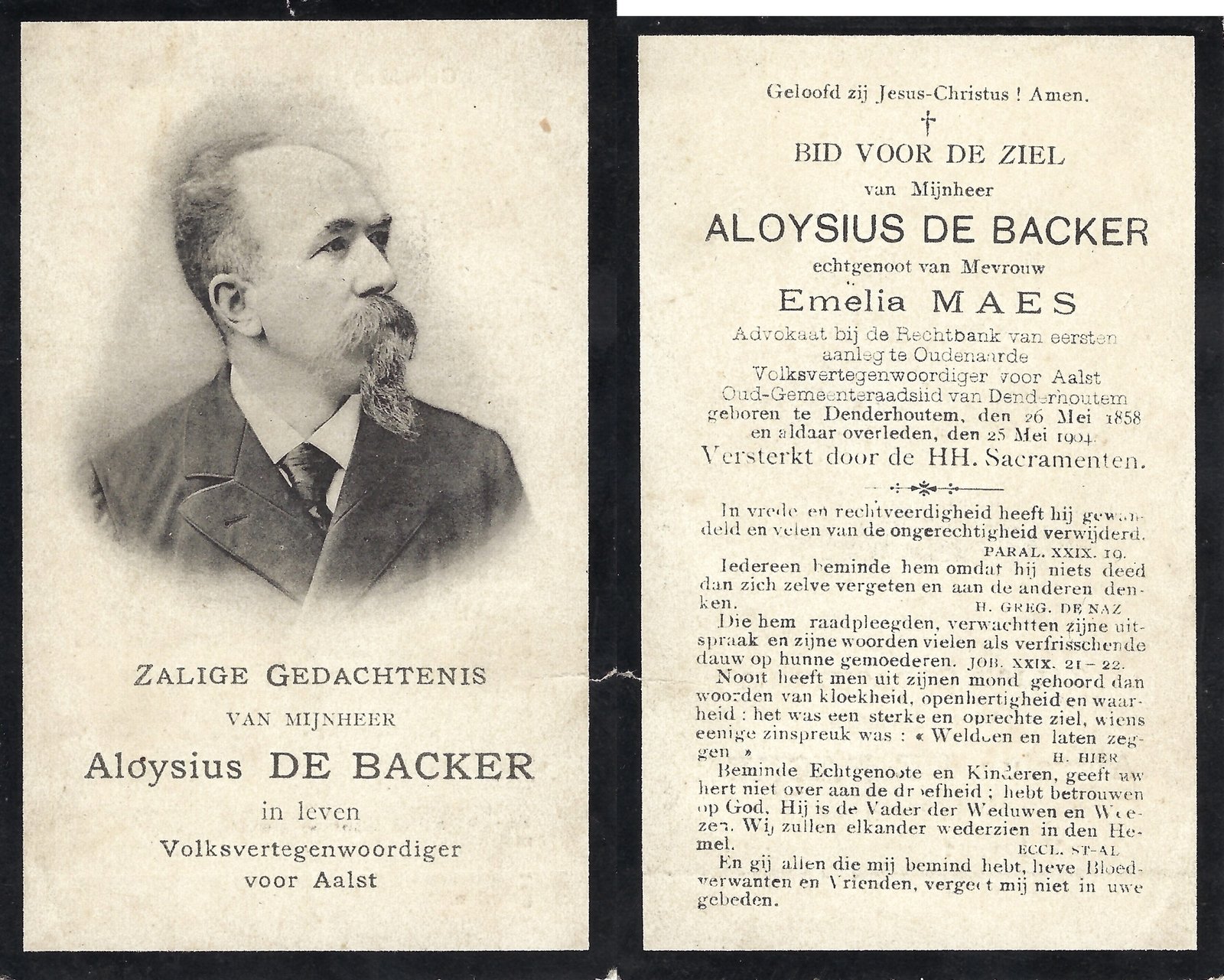 | De Backer Aloysius, Volksvertegenwoordiger, Gemeenteraadslid Denderhoutem | Denderhoutem | 26/05/1858 | Denderhoutem | 25/05/1904 |