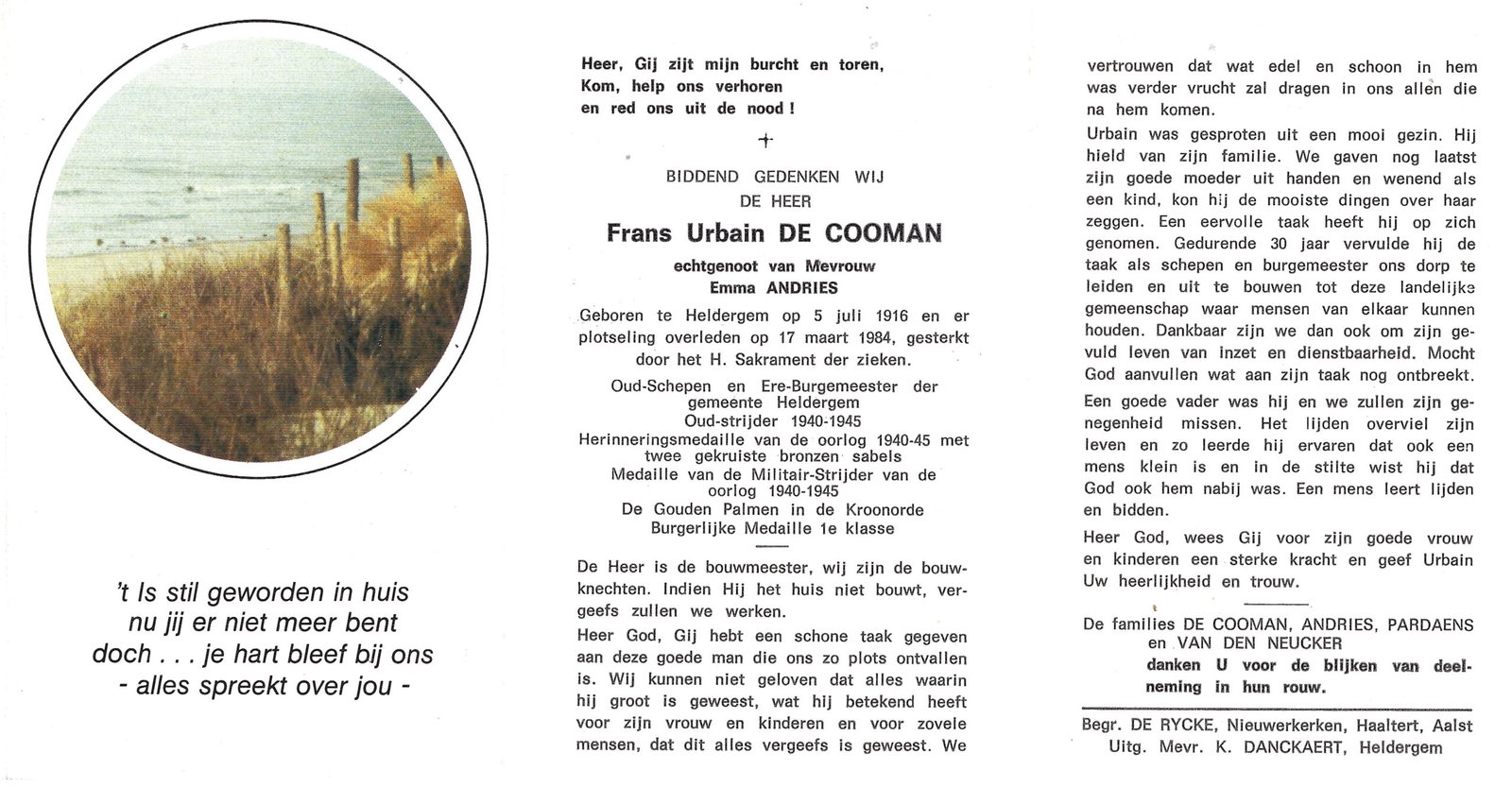 | De Cooman Frans Urbain, Burgemeester Heldergem | Heldergem | 05/07/1916 | Heldergem | 17/03/1984 |