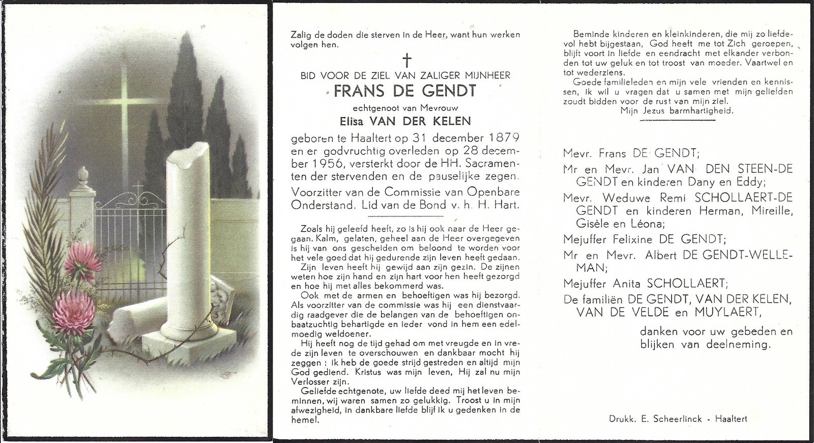 | De Gendt Frans, Voorzitter OCMW Haaltert | Haaltert | 31/12/1879 | Haaltert | 28/12/1956 |