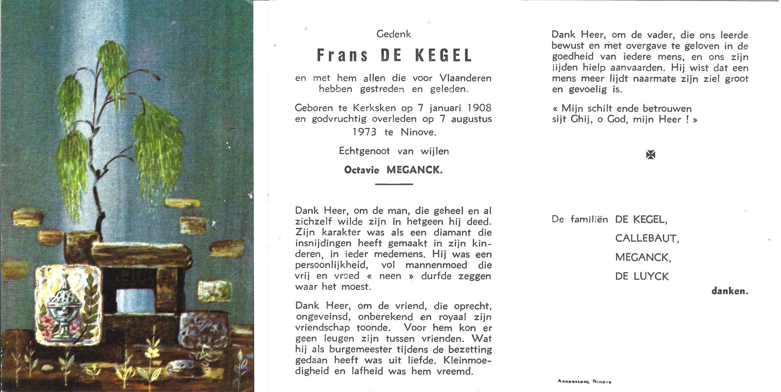 | De Kegel Frans, Burgemeester Kerksken | Kerksken | 07/01/1908 | Kerksken | 07/08/1973 |