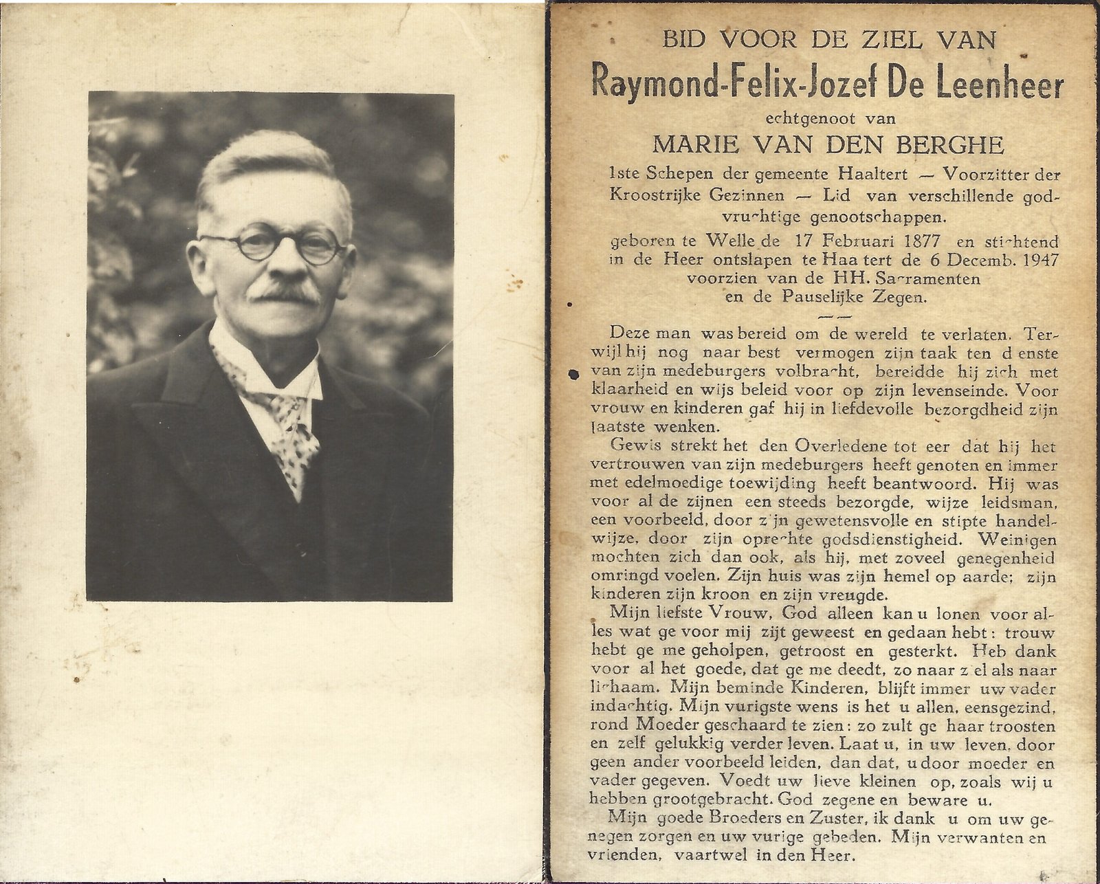 | De Leenheer Raymond, Schepen Haaltert | Welle | 17/02/1877 | Haaltert | 06/12/1947 |