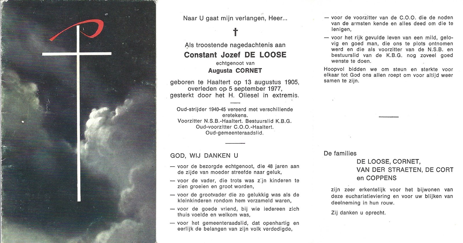 | De Loose Constant Jozef, Voorzitter OCMW Haaltert | Haaltert | 13/08/1905 | Haaltert | 05/09/1977 |