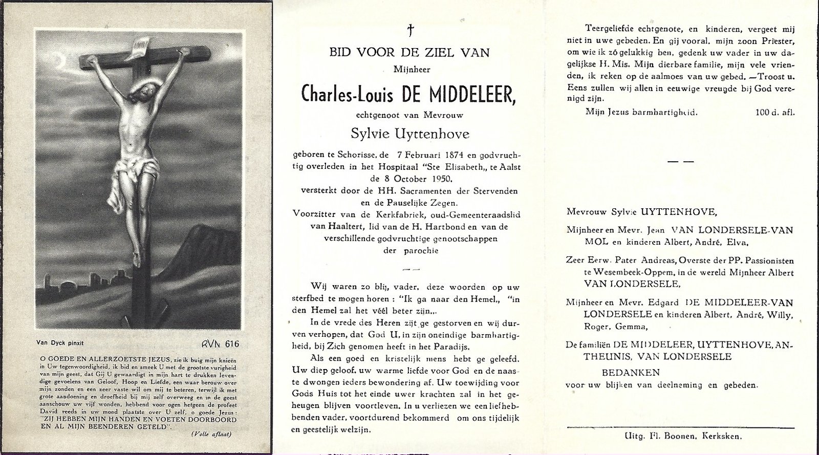 | De Middeleer Charles, Gemeenteraadslid Haaltert | Schorisse | 07/02/1874 | Aalst | 08/10/1950 |