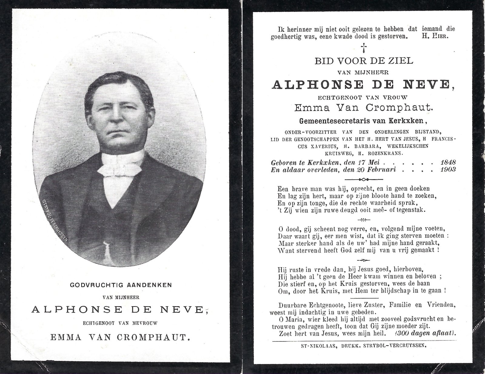 | De Neve Alphonse, Gemeentesecretaris Kerksken | Kerksken | 17/05/1848 | Kerksken | 20/02/1903 |