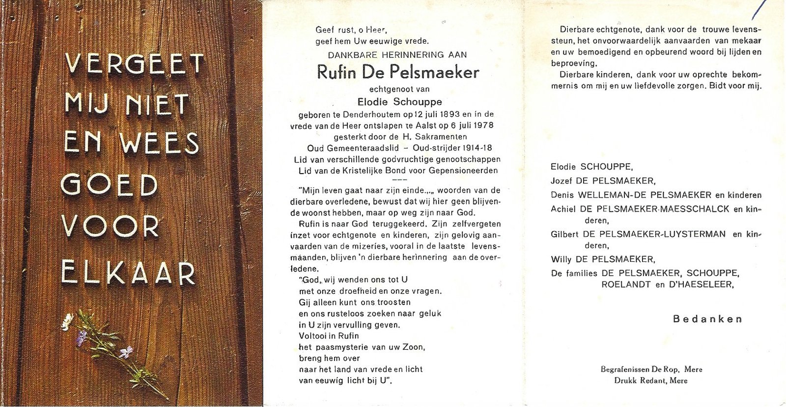 | De Pelsmaeker Rufin, Gemeenteraadslid Denderhoutem | Denderhoutem | 12/07/1893 | Aalst | 06/07/1978 |
