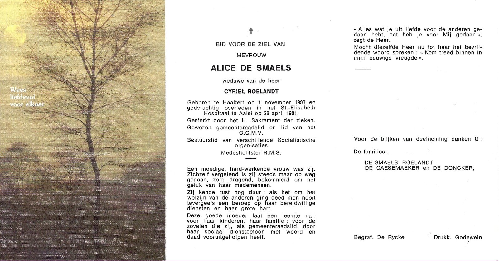 | De Smaels Alice, Gemeenteraadslid Haaltert | Haaltert | 01/11/1903 | Aalst | 28/04/1981 |