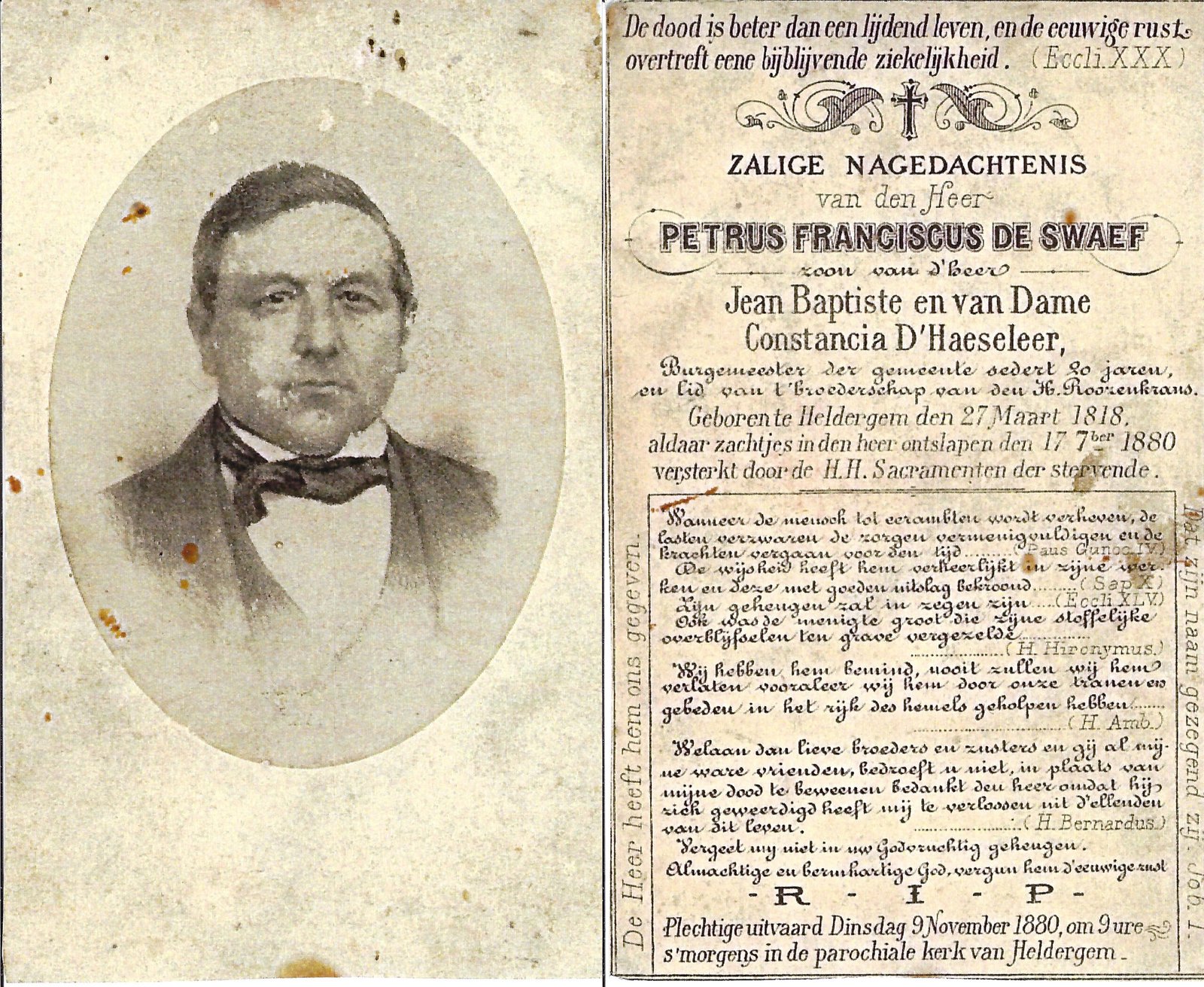 | De Swaef Petrus, Burgemeester Heldergem | Heldergem | 27/03/1818 | Heldergem | 17/09/1880 |