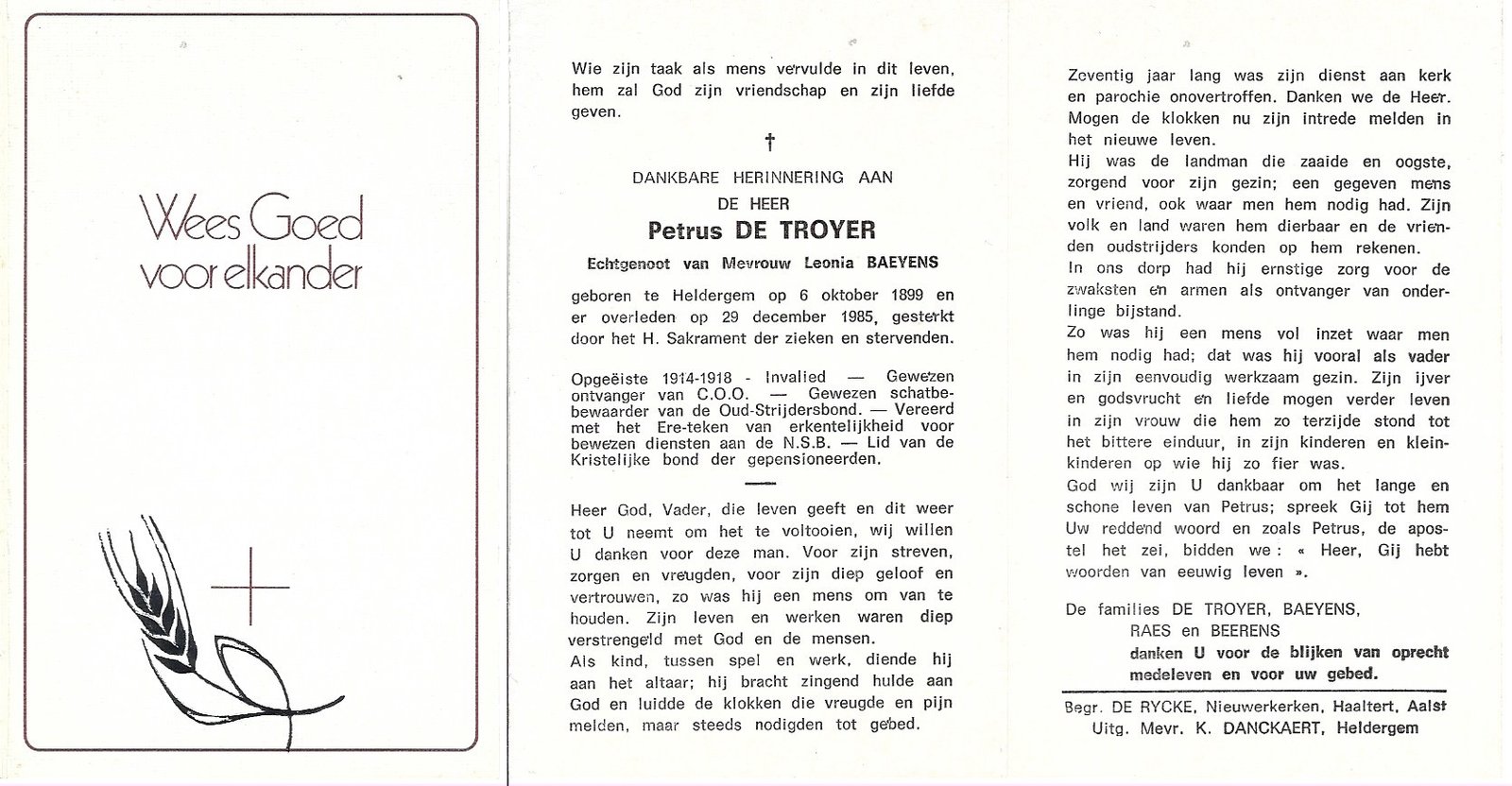 | De Troyer Petrus, OCMW-ontvanger Heldergem | Heldergem | 06/10/1899 | Heldergem | 29/12/1985 |