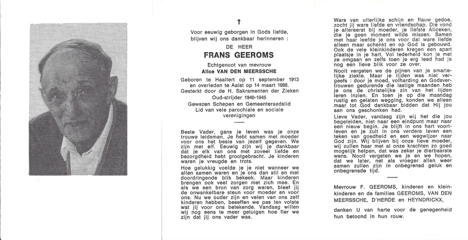 | Geeroms Frans, Schepen Haaltert | Haaltert | 11/09/1913 | Aalst | 14/03/1988 |