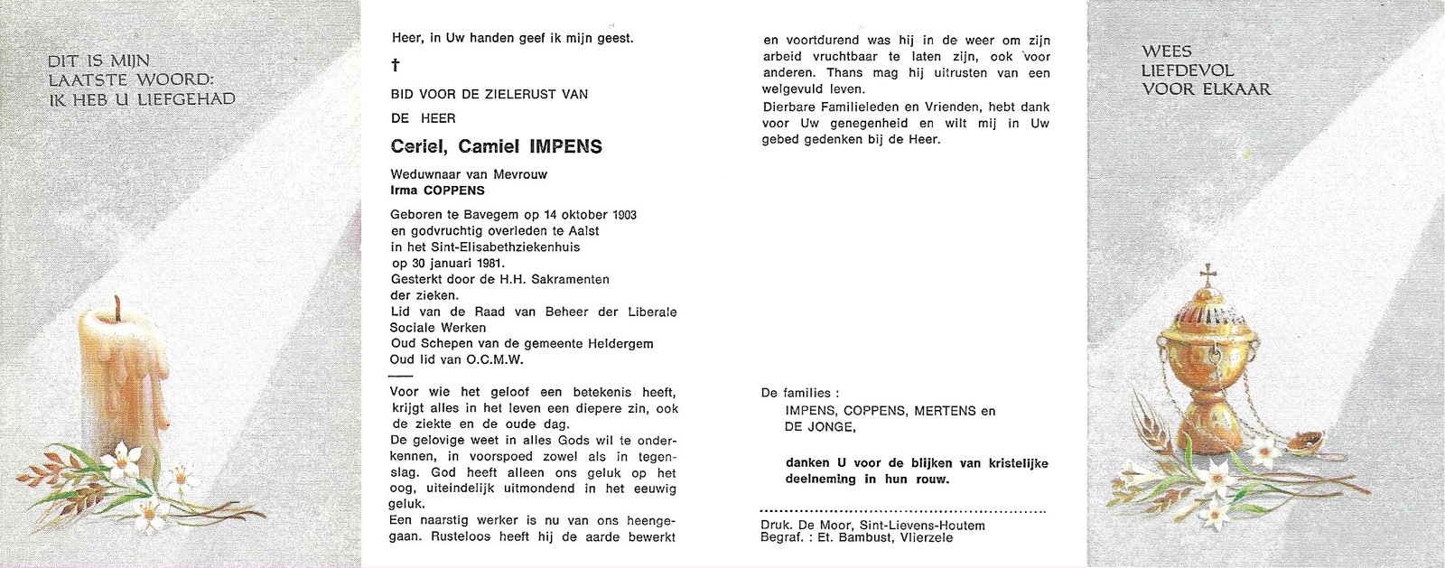| Impens Ceriel, Schepen Heldergem | Bavegem | 14/10/1903 | Aalst | 30/01/1981 |