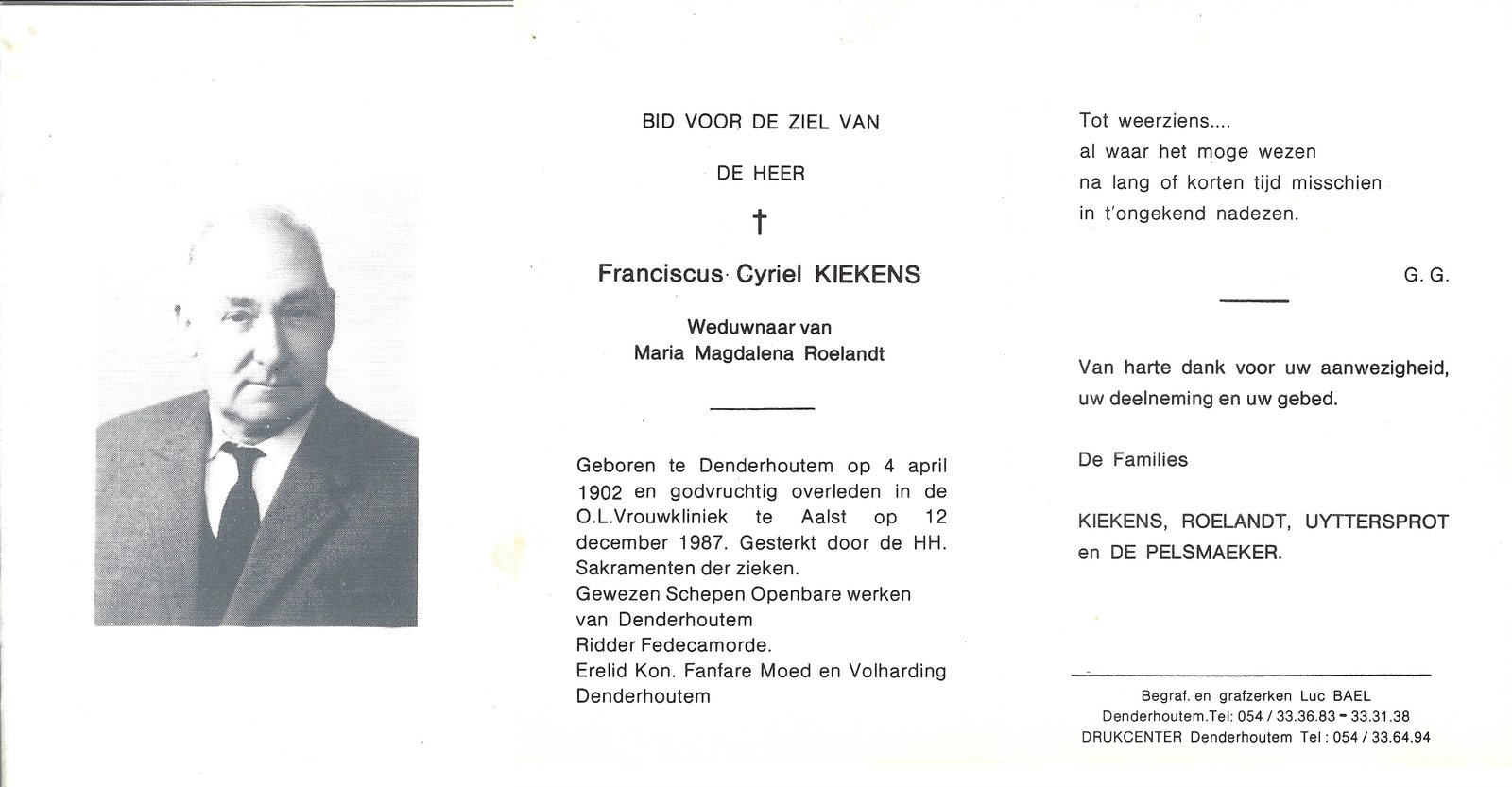 | Kiekens Franciscus, Schepen Denderhoutem | Denderhoutem | 04/04/1902 | Aalst | 12/12/1987 |