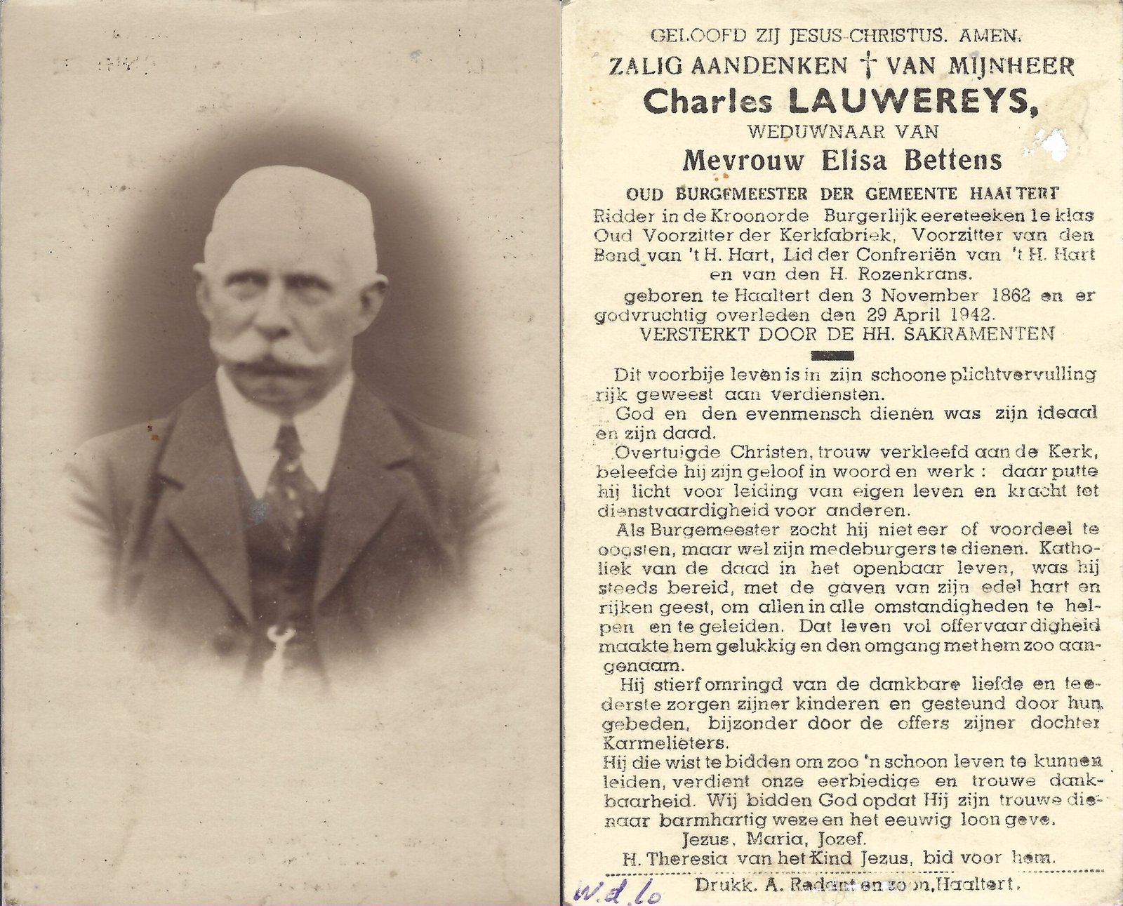| Lauwereys Charles, Burgemeester Haaltert | Haaltert | 03/11/1862 | Haaltert | 29/04/1942 |