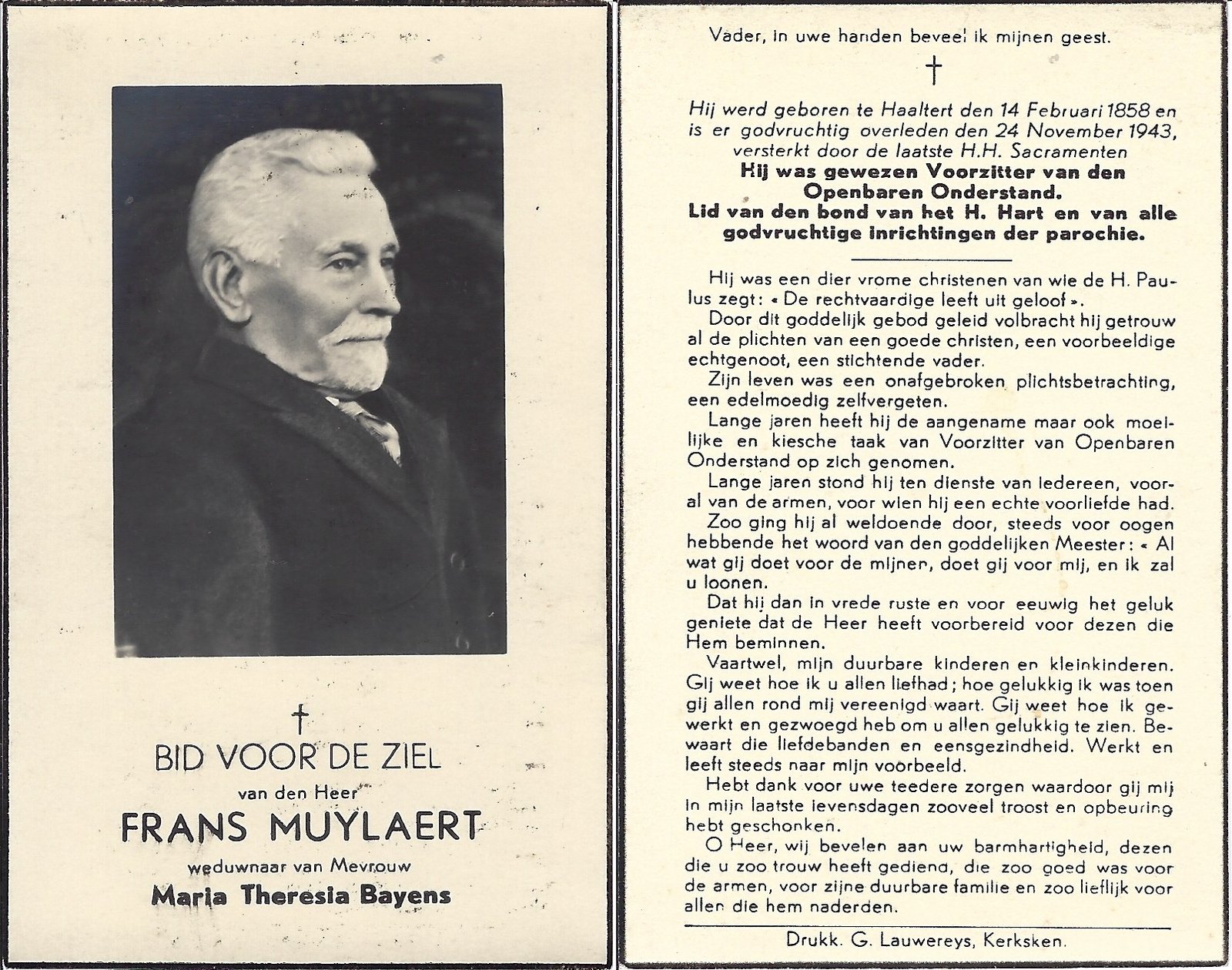 | Muylaert Frans, Voorzitter OCMW Haaltert | Haaltert | 14/02/1858 | Haaltert | 24/11/1943 |