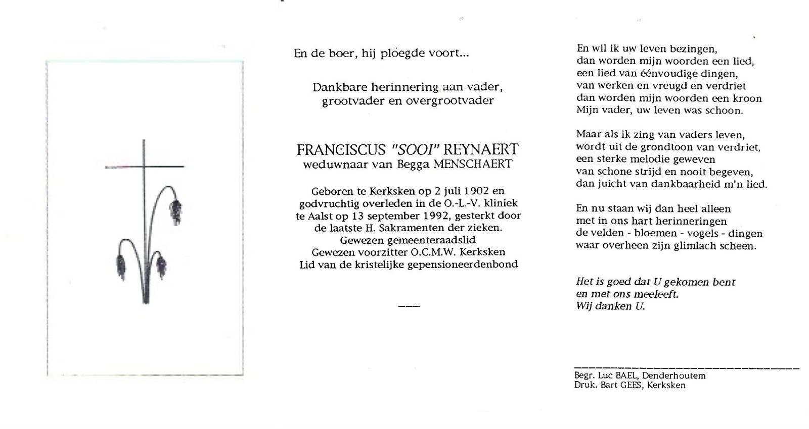 | Reynaert Franciscus, Gemeenteraadslid Kerksken | Kerksken | 02/07/1902 | Aalst | 13/09/1992 |