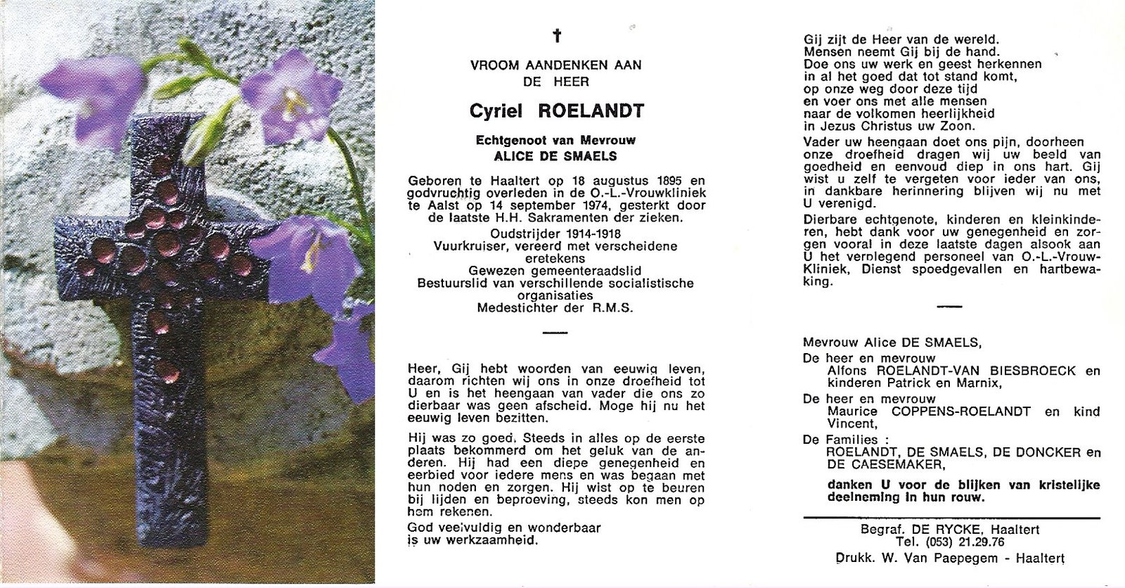 | Roelandt Cyriel, Gemeenteraadslid Haaltert | Haaltert | 18/08/1895 | Aalst | 14/09/1974 |