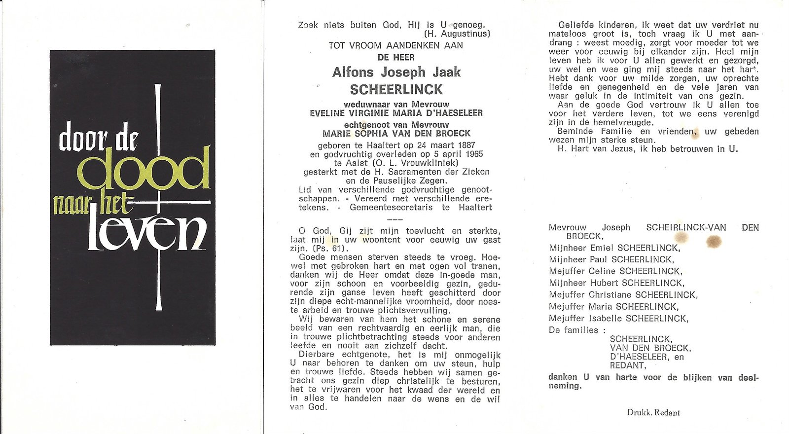 | Scheerlinck Alfons, Gemeentesecretaris Haaltert | Haaltert | 24/03/1887 | Aalst | 05/04/1965 |