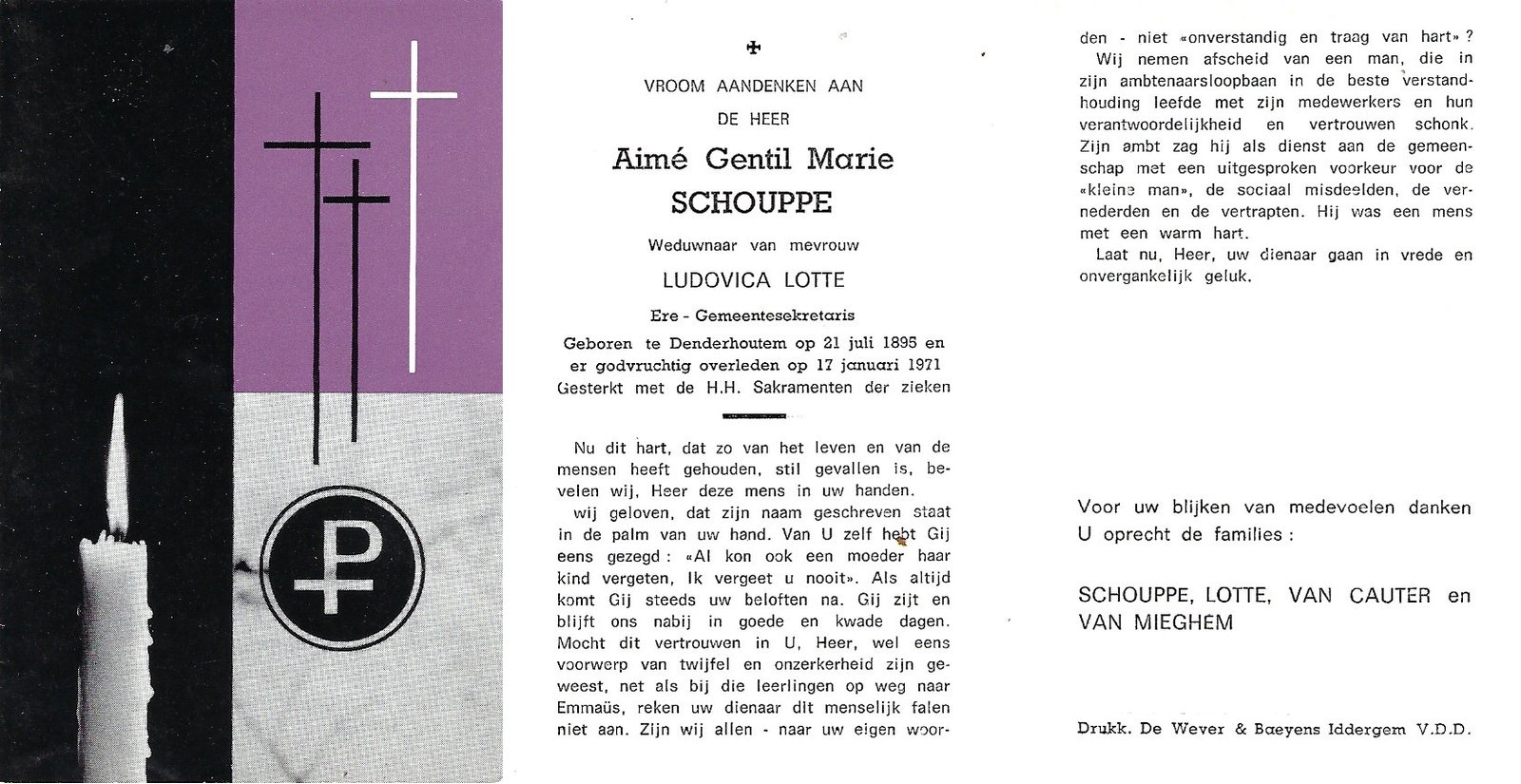 | Schouppe Aimé, Gemeentesecretaris Denderhoutem | Denderhoutem | 21/07/1895 | Denderhoutem | 17/01/1971 |