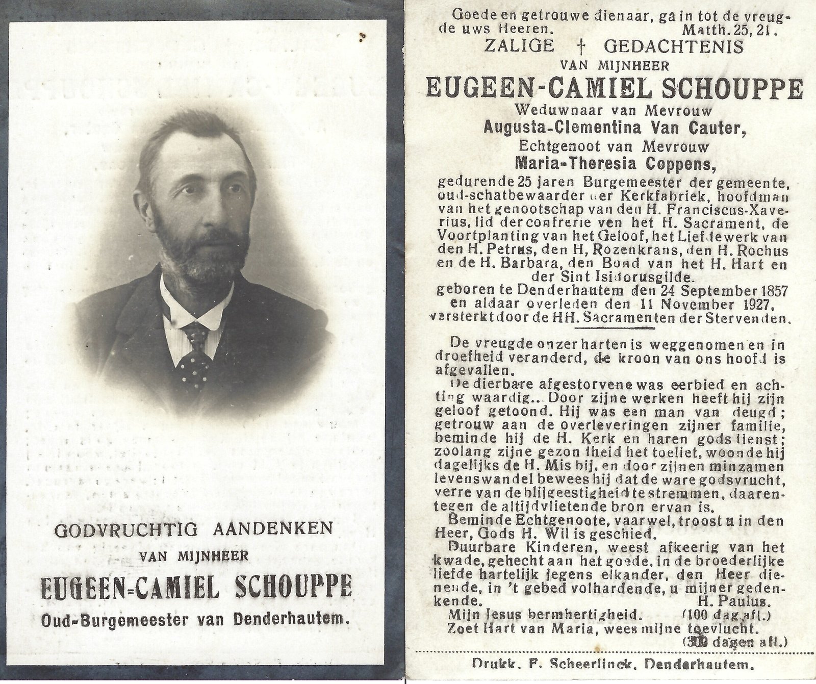 | Schouppe Eugeen, Burgemeester Denderhoutem | Denderhoutem | 24/09/1857 | Denderhoutem | 11/11/1927 |