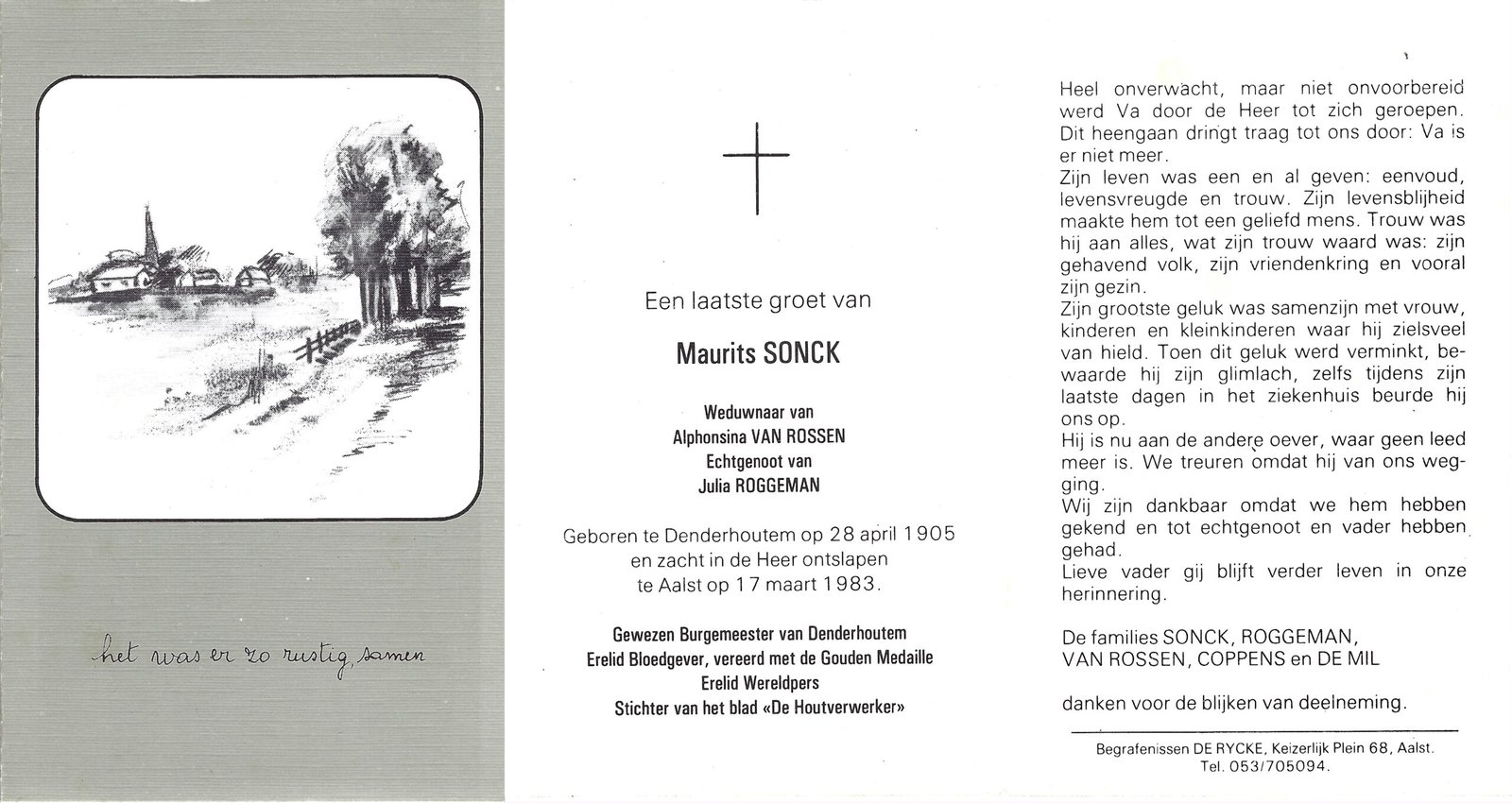 | Sonck Maurits, Burgemeester Denderhoutem | Denderhoutem | 28/04/1905 | Aalst | 17/03/1983 |