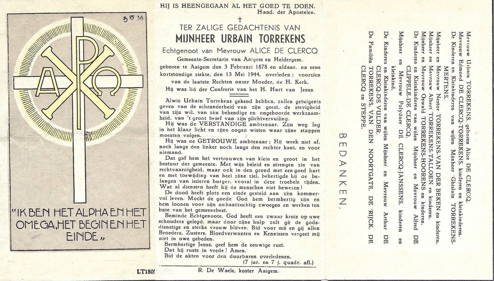 | Torrekens Urbain, Gemeentesecretaris Heldergem | Aaigem | 03/02/1878 | Aaigem | 13/05/1944 |
