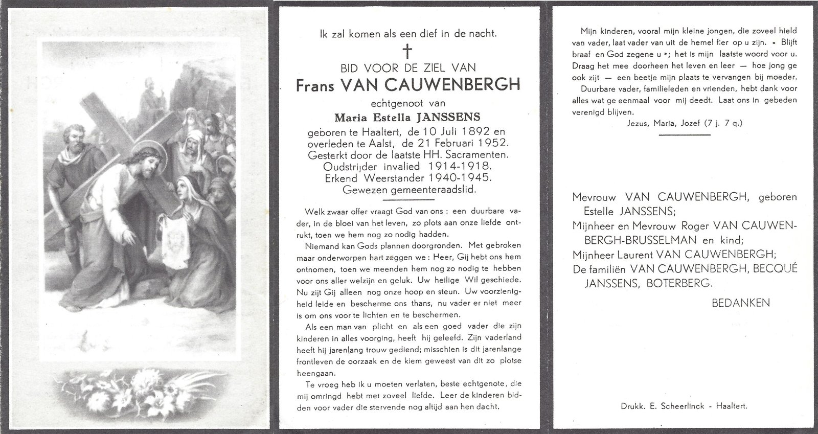 | Van Cauwenbergh Frans, Gemeenteraadslid Haaltert | Haaltert | 10/07/1892 | Aalst | 21/02/1952 |