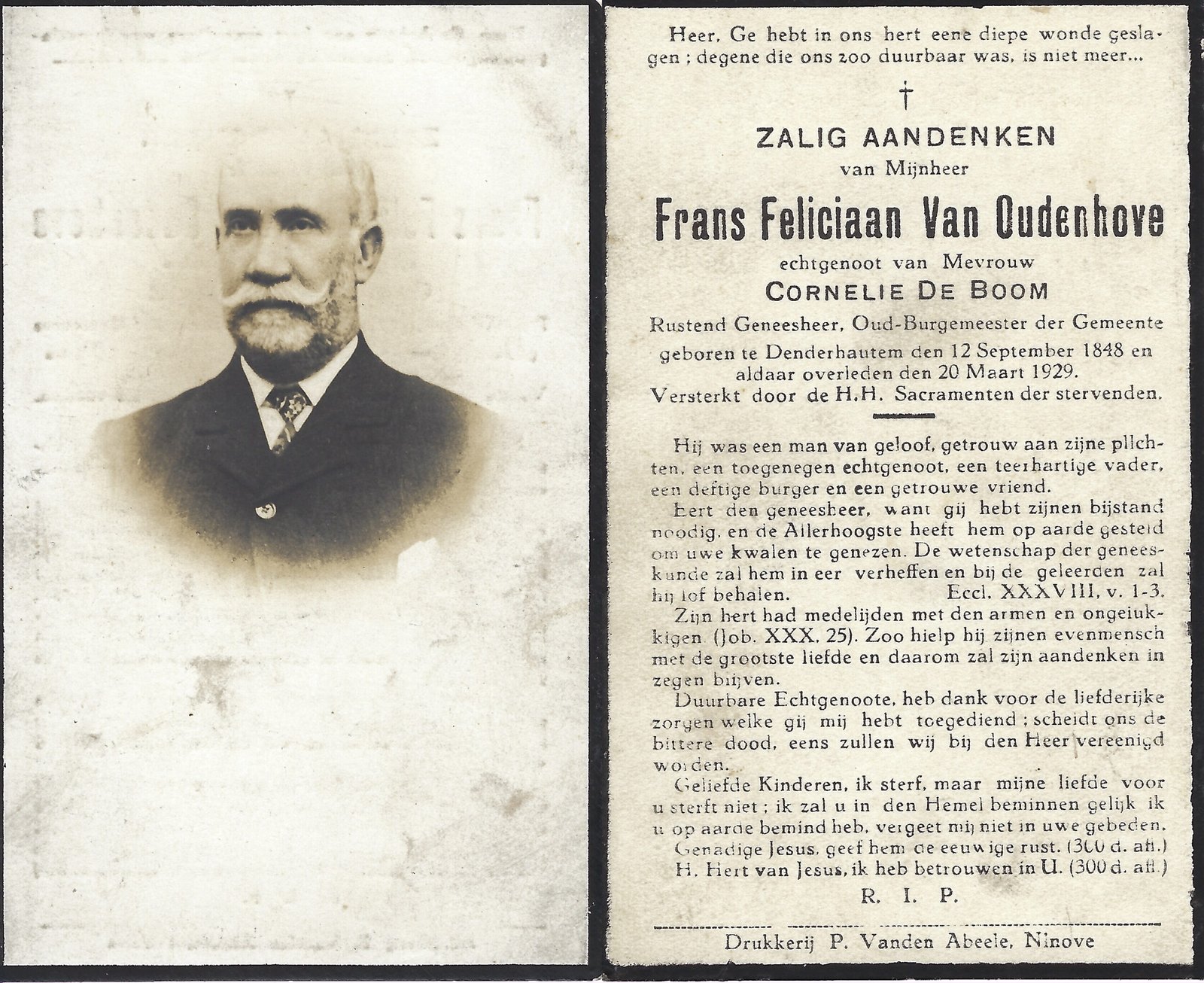 | Van Oudenhove Frans Feliciaan, Burgemeester Denderhoutem | Denderhoutem | 12/09/1848 | Denderhoutem | 20/03/1929 |